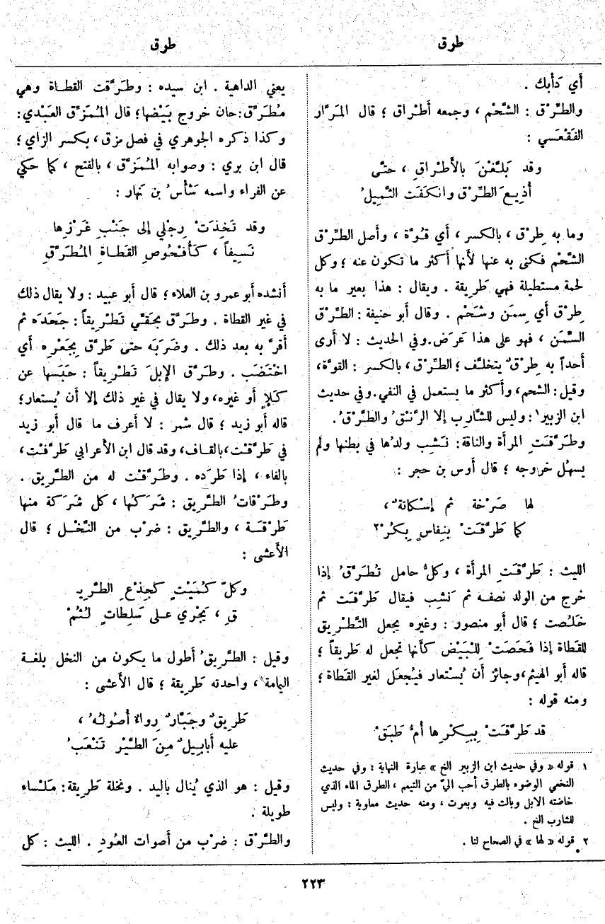 أَنشده أَبو عَمْرِو بْنُ الْعَلَاءِ؛ قَالَ أَبو عُبَيْدٍ: وَلَا يُقَالُ ذَلِكَ فِي غَيْرِ الْقَطَاةِ. وطَرَّق بحَقِّي تَطْرِيقاً: جَحَدَه ثُمَّ أَقرَّ بِهِ بَعْدَ ذَلِكَ. وضَرَبَه حَتَّى طَرَّق بِجَعْرِه أَي اخْتَضَب. وطَرَّق الإِبلَ تَطْرِيقاً: حَبَسها عَنْ كَلإٍ أَو غَيْرُهُ، وَلَا يُقَالُ فِي غَيْرِ ذَلِكَ إِلا أَن يُستعار؛ قَالَهُ أَبو زَيْدٍ؛ قَالَ شَمِرٌ: لَا أعَرف مَا قَالَ أَبو زَيْدٍ فِي طَرَّقْت، بِالْقَافِ، وَقَدْ قَالَ ابْنُ الأَعَرابي طَرَّفْت، بِالْفَاءِ، إِذا طَرَده. وطَرَّقْت لَهُ مِنَ الطَّرِيق. وطَرْقاتُ الطَّرِيق: شَرَكُها، كُلُّ شَرَكة مِنْهَا طَرْقَة، والطَّرِيق: ضرْب مِنَ النَّخْل؛ قَالَ الأَعشى: