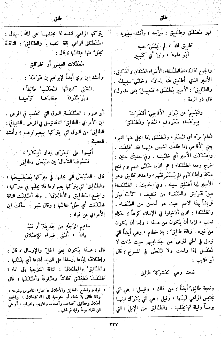 أَبو عَمْرٍو: الطَّلَقَة النُّوقُ الَّتِي تُحْلب فِي الْمَرْعَى. ابْنُ الأَعرابي: الطالِقُ النَّاقَةُ تُرْسَلُ فِي الْمَرْعَى. الشَّيْبَانِيُّ: الطالِقُ مِنَ النُّوقِ الَّتِي يَتْرُكُهَا بِصِرارِها؛ وأَنشد لِلْحُطَيْئَةِ: