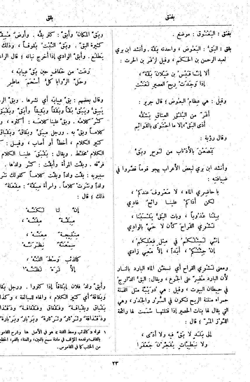 وَقَالَ بَعْضُهُمْ: بقَّ عِيابَه أَيْ نَشَرَهَا. وبقَّ الرجلُ يَبِقُّ ويَبُقُّ بَقّاً وبَقَقاً وبَقِيقاً وأبَقَّ وبَقْبَقَ: كثُرَ كلامُه. وبقَّ عَلَيْنَا كلامَه: أَكثره، وبقَّ كَلَامًا وبقَّ بِهِ. وَرَجُلٌ مِبَقٌّ وبَقاقٌ وبَقْباقٌ: كَثِيرُ الْكَلَامِ، أَخطأ أَو أَصاب، وَقِيلَ: كَثِيرُ الْكَلَامِ مُخلِّط. وَيُقَالُ: بَقْبَقَ عَلَيْنَا الْكَلَامَ أَيْ فرَّقه. وبقَّت المرأَة وأبقَّت: كثُر ولدُها. قَالَ سِيبَوَيْهِ: بقَّت وَلَدًا وبقَّت كَلَامًا كَقَوْلِكَ نثَرتْ وَلَدًا ونثَرتْ كَلَامًا. وامرأَة مِبَقَّةٌ: مِفْعَلةٌ مِنْ ذَلِكَ؛ قَالَ: