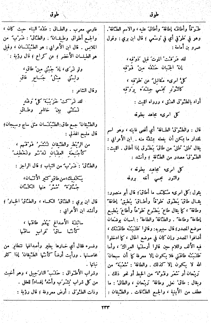 يَقُولُ: كُلُّ امْرِئٍ مُكلّف مَا أَطاق؛ قَالَ أَبو مَنْصُورٍ: يُقَالُ طاقَ يَطُوق طَوْقاً وأَطاقَ يُطيقُ إِطاقةً وَطَاقَةً، كَمَا يُقَالُ طاعَ يَطُوع طَوْعاً وأَطاعَ يُطيع إِطاعةً وَطَاعَةً. والطَّاقةُ والطاعةُ: اسْمَانِ يوضَعان مَوْضِعَ الْمَصْدَرِ؛ قَالَ سِيبَوَيْهِ: وَقَالُوا طَلَبْتَه طاقَتَك، أَضافوا الْمَصْدَرَ وإِن كَانَ فِي مَوْضِعِ الْحَالِ، كَمَا أَدْخَلُوا فِيهِ الأَلف وَاللَّامَ حِينَ قَالُوا أَرسلَها العِراكَ، وأَما طَلَبْتُه طاقَتي فَلَا يَكُونُ إِلا مَعْرِفَةً كَمَا أَن سبحانَ اللَّهِ لَا يَكُونُ إِلا كَذَلِكَ. والطاقةُ: شُعْبَةٌ مِنْ رَيْحان أَو شَعَر وقُوَّةٌ مِنَ الْخَيْطِ أَو نَحْوَ ذَلِكَ. وَيُقَالُ: طاقُ نعلٍ وطاقةُ رَيْحانٍ، والطاقُ: مَا عَطَفَ مِنَ الأَبنية، وَالْجَمْعُ الطَّاقات. والطَّيقان: فَارِسِيٌّ مُعَرَّبٌ. وَالطَّاقُ: عَقْدُ الْبِنَاءِ حَيْثُ كَانَ، وَالْجَمْعُ أَطواق وطِيقانٌ. والطَّاقُ: ضَرْبٌ مِنَ الْمَلَابِسِ. قَالَ ابْنُ الأَعرابي: هُوَ الطَّيْلَسان، وَقِيلَ هُوَ الطَّيْلَسَانُ الأَخضر؛ عَنْ كُرَاعٍ؛ قَالَ رُؤْبَةُ: