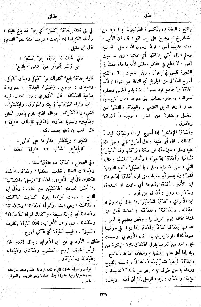 وَفِي الصِّحَاحِ: عَذَّقَ عَنْهُ عاذِقٌ سَعَفًا. وعَذَقْت النَّخْلَةَ: قَطَعْتُ سعَفَها، وعَذَّقَت، شُدِّدَ لِلْكَثْرَةِ. قَالَ ابْنُ الأَعرابي: اعْتَذَقَ الرجلُ واعْتَذَب إِذا أَسبْل لِعِمَامَتِهِ عَذَبَتَيْن مِنْ خَلْفٍ، وَقَالَ ابْنُ الْفَرَجِ: سَمِعْتُ عَرَّاماً يَقُولُ كذبت عَذَّاقَتُه وعَذَّابَتُه، وَهِيَ اسْتُهُ. وامرأَة عَقْذَانةٌ «5» وشَقْذانةٌ وعَذْقانة أَي بَذِيَّة سَلِيطَةٌ، وَكَذَلِكَ امرأَة سَلَطَانَةٌ وسَلَتانة. وَفِي نَوَادِرِ الأَعراب: فُلَانٌ عَذِقٌ بِالْقُلُوبِ ولَبِقٌ وطِيب عَذِقٌ أَي ذَكِيُّ الريح.