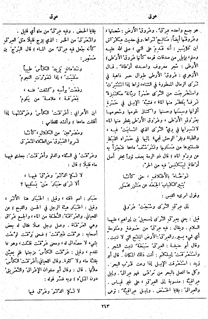 قِيلَ: يعني بِعرْقِ الثَّرَى إِسمعيلَ بْنُ إِبراهيم، عَلَيْهِمَا السَّلَامُ. وَيُقَالُ: فِيهِ عِرْقٌ مِنْ حُموضةٍ ومُلوحةٍ أَي شَيْءٌ يَسِيرٌ. والعِرْقُ: الأَرض المِلْح الَّتِي لَا تُنْبِتُ. وَقَالَ أَبو حَنِيفَةَ: العِرْقُ سَبَخَةٌ تُنْبِتُ الشَّجَرَ. واسْتَعْرَقَتْ إِبِلكُم: أَتت ذَلِكَ الْمَكَانَ. قَالَ أَبو زَيْدٍ: اسْتَعَرقت الإِبل إِذا رَعَتْ قُرْب الْبَحْرِ. وَكُلُّ مَا اتَّصَلَ بِالْبَحْرِ مِنْ مَرْعًى فَهُوَ عِراقٌ. وإِبل عِراقيَّة: مَنْسُوبَةٌ إِلى العِرْقِ، عَلَى غَيْرِ قِيَاسٍ. والعِراقُ: بَقَايَا الحَمْض. وإِبل عِراقيَّةٌ: تَرْعَى بَقَايَا الْحَمْضِ. وَفِيهِ عِرْقٌ مِنْ ماءٍ أَي قَلِيلٌ. والمُعْرَقُ مِنَ الْخَمْرِ: الَّذِي يُمْزَجُ قَلِيلًا مثلَ العِرْقِ كأَنه جُعل فِيهِ عِرْقٌ مِنَ الْمَاءِ؛ قَالَ البُرْجُ بْنُ مُسْهِرٍ: