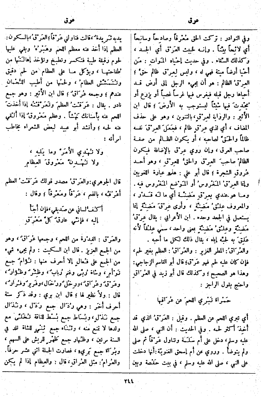 ؛ العَرْقُ، بِالسُّكُونِ: الْعَظْمُ إِذا أُخذ عَنْهُ مُعْظَمُ اللَّحْمِ وهَبْرُهُ وَبَقِيَ عَلَيْهَا لُحُومٌ رَقِيقَةٌ طَيِّبَةٌ فَتُكْسَرُ وَتُطْبَخُ وتؤْخذ إِهالَتُها مِنْ طُفاحتها، وَيُؤْكَلُ مَا عَلَى الْعِظَامِ مِنْ لَحْمٍ دَقِيقٍ وتُتَمَشَّش العظامُ، ولحمُها مِنْ أَطيب اللُّحْمانِ عِنْدَهُمْ؛ وَجَمْعُهُ عُرَاقٌ؛ قَالَ ابْنُ الأَثير: وَهُوَ جَمْعٌ نَادِرٌ. يُقَالُ: عَرَقْتُ العظمَ وتَعَرَّقْتُه إِذا أَخذتَ اللَّحْمَ عَنْهُ بأَسنانك نَهْشاً. وَعَظْمٌ مَعْروقٌ إِذَا أُلقي عَنْهُ لَحْمُهُ؛ وأَنشد أَبو عُبَيْدٍ لِبَعْضِ الشُّعَرَاءِ يُخَاطِبُ امرأَته: