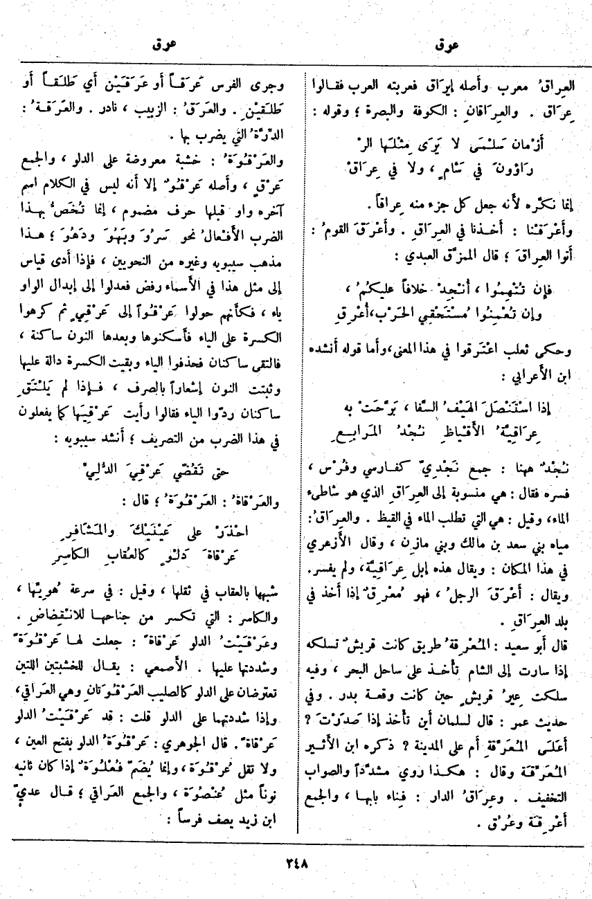 إِنما نكَّره لأَنه جَعَلَ كُلَّ جُزْءٍ مِنْهُ عِراقاً. وأَعْرَقْنا: أَخذنا فِي العِرَاقِ. وأَعْرَقَ القومُ: أَتوا العِراقَ؛ قَالَ الممزَّق الْعَبْدِيُّ: