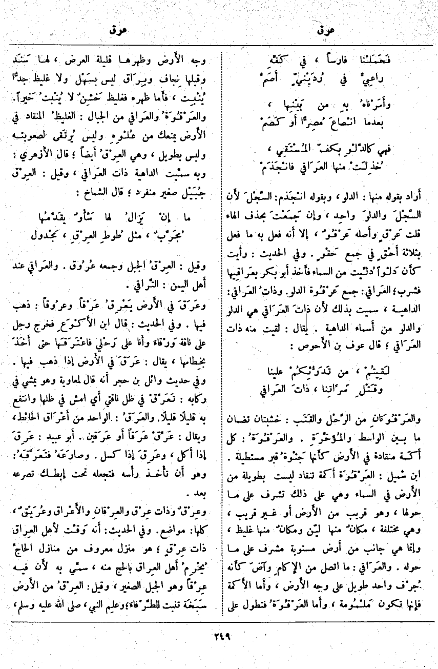 والعَرْقُوَتانِ مِنَ الرَّحْل والقَتَب: خَشَبَتَانِ تُضَمَّانِ مَا بَيْنَ الْوَاسِطِ والمُؤَخَّرةِ. والعَرْقُوَةُ: كُلُّ أَكَمة مُنْقَادَةٍ فِي الأَرض كأَنها جَثْوةُ قَبْرٍ مُسْتَطِيلَةٌ. ابْنُ شُمَيْلٍ: العَرْقُوَة أَكمة تَنْقَادُ لَيْسَتْ بِطَوِيلَةٍ مِنَ الأَرض فِي السَّمَاءِ وَهِيَ عَلَى ذَلِكَ تُشْرِفُ عَلَى مَا حَوْلَهَا، وَهُوَ قَرِيبٌ مِنَ الأَرض أَو غَيْرُ قَرِيبٍ، وَهِيَ مُخْتَلِفَةٌ، مكانٌ مِنْهَا لَيِّنٌ ومكانٌ مِنْهَا غَلِيظٌ، وإِنما هِيَ جَانِبٌ مِنْ أَرض مُسْتَوِيَةٍ مُشْرِفٌ عَلَى مَا حَوْلَهُ. والعَرَاقي: مَا اتَّصَلَ مِنِ الإِكامِ وآضَ كأَنه جُرْف وَاحِدٌ طَوِيلٌ عَلَى وَجْهِ الأَرض، وأَما الأَكمة فإِنها تَكُونُ مَلْمُومة، وأَما العَرْقُوَةُ فَتَطُولُ عَلَى وَجْهِ الأَرض وَظَهِرُهَا قَلِيلَةُ الْعَرْضِ، لَهَا سَنَد وَقَبْلَهَا نِجاف وبِرَاق لَيْسَ بسَهْل وَلَا غَلِيظٍ جِدًّا يُنْبِت، فأَما ظَهْرُهُ فَغَلِيظٌ خَشِنٌ لَا يُنْبتُ خَيراً. والعَرْقُوَةُ والعَراقي مِنَ الْجِبَالِ: الغليظُ الْمُنْقَادُ فِي الأَرض يَمْنَعُكَ مِنْ عُلْوِهِ وَلَيْسَ يُرتَقى لِصُعُوبَتِهِ وَلَيْسَ بِطَوِيلٍ، وَهِيَ العِرْقُ أَيضاً؛ قَالَ الأَزهري: وَبِهِ سمِّيت الدَّاهِيَةُ ذَاتَ العَراقي، وَقِيلَ: العِرْق جُبَيْل صَغِيرٌ مُنْفَرِدٌ؛ قَالَ الشَّمَّاخُ: