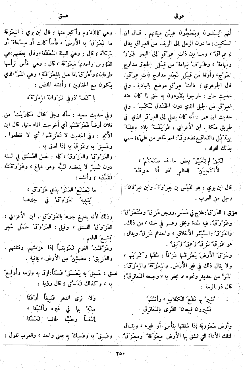 عزق: العَزْقُ: عِلَاجٌ فِي عَسَرٍ. وَرَجُلٌ عَزِقٌ ومُتَعَزِّقٌ وعَزْوَقٌ: فِيهِ شِدَّةٌ وَبُخْلٌ وَعُسْرٌ فِي خُلُقِهِ، مِنْ ذَلِكَ. والعُزُقُ: السِّيِّئُو الأَخلاقِ، وَاحِدُهُمْ عَزِقٌ. وَيُقَالُ: هُوَ عَزِقٌ نَزِقٌ زَعِقٌ زَنِقٌ. وعَزَقَ الأَرضَ يَعْزِقُها عَزْقاً: شَقَّهَا وكَرَبَها، وَلَا يُقَالُ ذَلِكَ فِي غَيْرِ الأَرض. والمِعْزَقةُ والمِعْزَقُ: المَرُّ مِنْ حديدٍ وَنَحْوِهِ مِمَّا يَحْفِرُ بِهِ، وَجَمْعُهُ المَعازِقُ؛ قَالَ ذُو الرُّمَّةِ:
