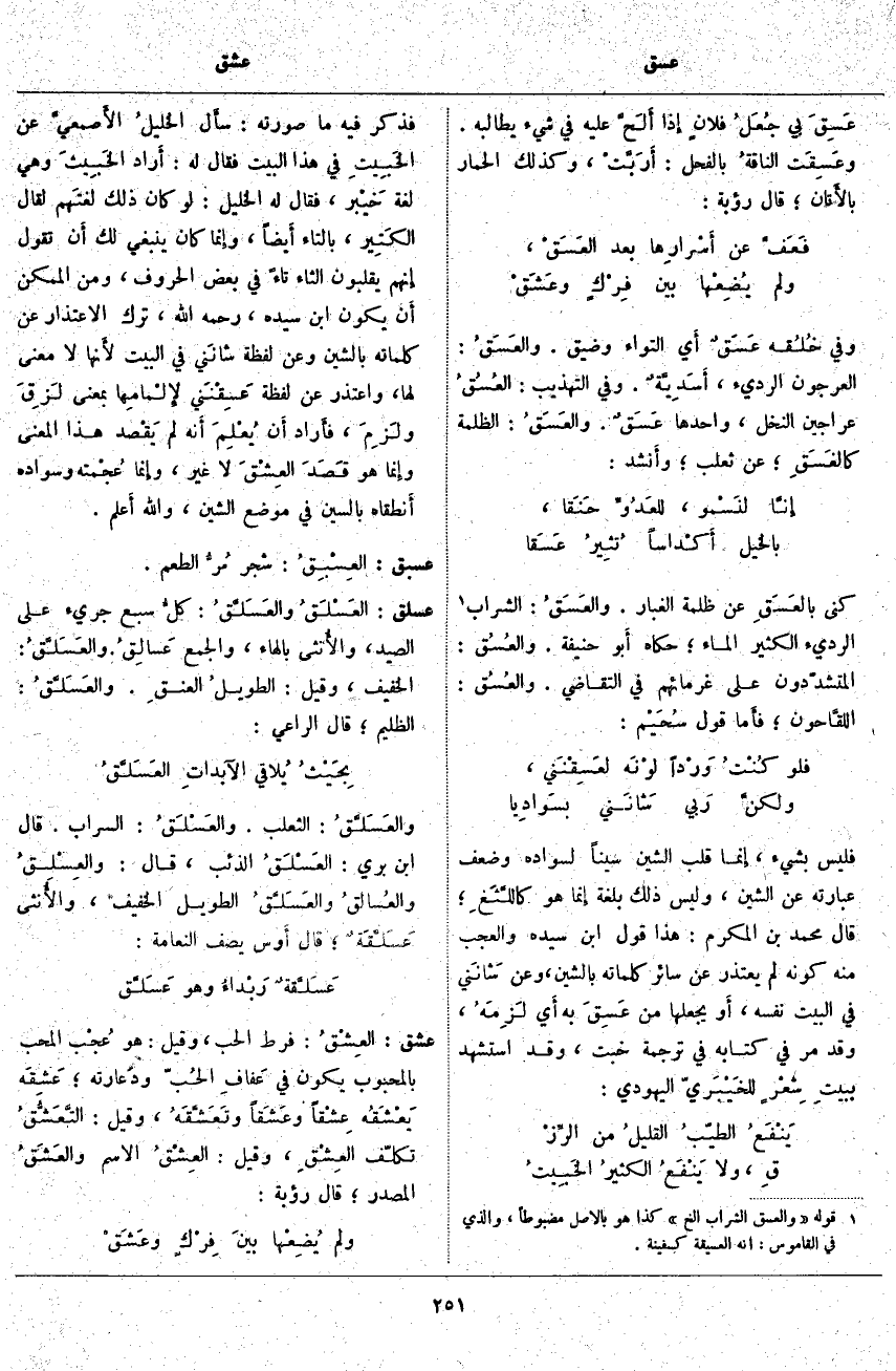فَذَكَرَ فِيهِ مَا صُورَتُهُ: سأَل الخليلُ الأَصمعيَّ عَنِ الخَبِيتِ فِي هَذَا الْبَيْتِ فَقَالَ له: أَراد الخَبِيتَ وَهِيَ لُغَةُ خَيْبَر، فَقَالَ لَهُ الْخَلِيلُ: لَوْ كَانَ ذَلِكَ لغتَهم لَقَالَ الكَتِير، بِالتَّاءِ أَيضاً، وإِنما كَانَ يَنْبَغِي لَكَ أَن تَقُولَ إِنهم يَقْلِبُونَ الثَّاءَ تَاءً فِي بَعْضِ الْحُرُوفِ، وَمِنَ الْمُمْكِنِ أَن يَكُونَ ابْنُ سِيدَهْ، رَحِمَهُ اللَّهُ، تَرَكَ الِاعْتِذَارَ عَنْ كَلِمَاتِهِ بِالشِّينِ وَعَنْ لَفْظِهِ شانَني فِي الْبَيْتِ لأَنها لَا مَعْنَى لَهَا، وَاعْتَذَرَ عَنْ لَفْظَةٍ عَسِقْنَني لإِلْمامِها بِمَعْنَى لَزِقَ ولَزمَ، فأَراد أَن يُعْلِمَ أَنه لَمْ يَقْصد هَذَا الْمَعْنَى وإِنما هُوَ قَصَدَ العِشْقَ لَا غَيْرَ، وإِنما عُجْمته وَسَوَادُهُ أَنطقاه بِالسِّينِ فِي مَوْضِعِ الشِّينِ، وَاللَّهُ أَعلم.