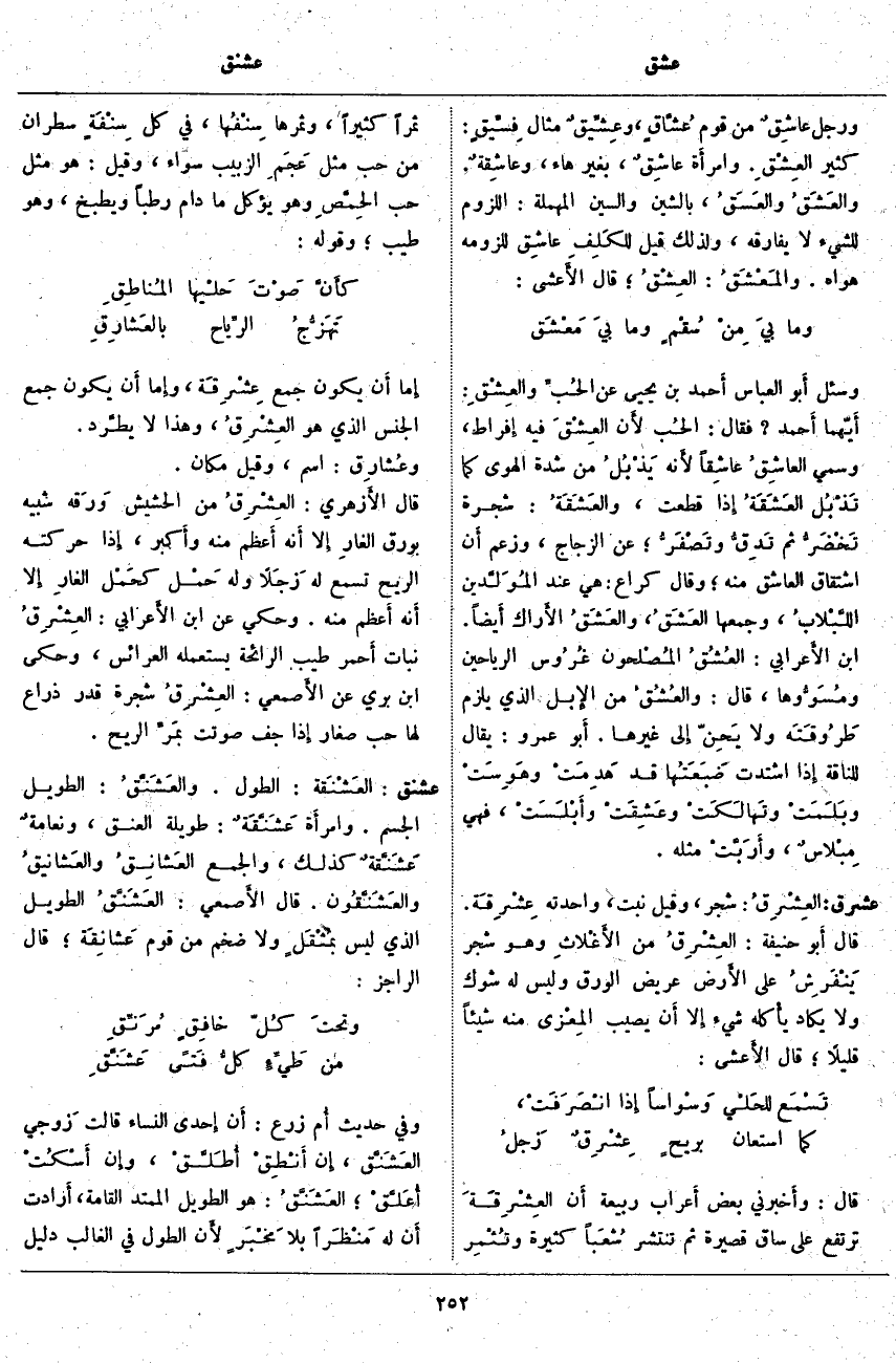 وَسُئِلَ أَبو الْعَبَّاسِ أَحمد بْنُ يَحْيَى عَنْ الحُبِّ والعِشْقِ: أَيّهما أَحمد؟ فَقَالَ: الحُب لأَن العِشْقَ فِيهِ إِفراط، وَسُمِّي العاشِقُ عاشِقاً لأَنه يَذْبُلُ مِنْ شِدَّةِ الْهَوَى كَمَا تَذْبُل العَشَقَةُ إِذا قُطِعَتْ، والعَشَقَةُ: شَجَرَةٌ تَخْضَرُّ ثُمَّ تَدِقُّ وتَصْفَرُّ؛ عَنِ الزَّجَّاجِ، وَزَعَمَ أَن اشْتِقَاقَ الْعَاشِقِ مِنْهُ؛ وَقَالَ كُرَاعٌ: هِيَ عِنْدَ المُوَلَّدين اللَّبْلابُ، وَجَمْعُهَا العَشَقُ، والعَشَقُ الأَراك أَيضاً. ابْنُ الأَعرابي: العُشُقُ المُصْلحون غُرُوس الرَّيَاحِينِ ومُسَوُّوها، قَالَ: والعُشُقُ مِنِ الإِبل الَّذِي يَلْزَمُ طَرُوقَتَه وَلَا يَحنّ إِلى غَيْرِهَا. أَبو عَمْرٍو: يُقَالُ لِلنَّاقَةِ إِذا اشْتَدَّتْ ضَبَعَتُها قَدْ هَدِمَتْ وهَوِسَتْ وبَلَمَتْ وتَهالَكَتْ وعَشِقَتْ وأَبْلَسَتْ، فَهِيَ مِبْلاسٌ، وأَرَبَّتْ مثله.