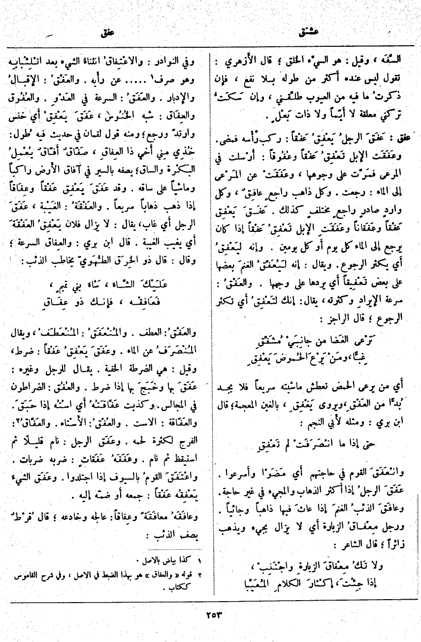 عفق: عَفَقَ: الرجلُ يَعْفِقُ عَفْقاً: رَكِبَ رَأْسه فَمَضَى. وعَفَقَت الإِبل تَعْفِقُ عَفْقاً وعُفُوقاً: أُرْسلت فِي الْمَرْعَى فَمرَّت عَلَى وُجُوهِهَا، وعَفَقَتْ عَنِ المَرْعى إِلى الْمَاءِ: رَجَعَتْ. وَكُلُّ ذَاهِبٍ راجعٍ عافِقٌ، وَكُلُّ واردٍ صادرٍ راجعٍ مختلفٍ كَذَلِكَ. عَفَقَ يَعْفِق عَفْقاً وعَفَقاناً وعَفَقَتِ الإِبل تَعْفِقُ عَفْقاً إِذا كَانَ يَرْجِعُ إِلى الْمَاءِ كُلَّ يَوْمٍ أَو كُلَّ يَوْمَيْنِ. وإِنه لَيَعْفِقُ أَي يُكْثِرُ الرُّجُوعَ. وَيُقَالُ: إِنه لَيُعَفِّقُ الغنمَ بَعْضَهَا عَلَى بَعْضٍ تَعْفِيقاً أَي يَرُدُّهَا عَلَى وَجْهِهَا. والعَفْقُ: سُرْعَةُ الإِيرادِ وَكَثْرَتُهُ، يُقَالُ: إِنك لتَعْفِقُ أَي تُكْثِرُ الرُّجُوعَ؛ قَالَ الرَّاجِزُ: