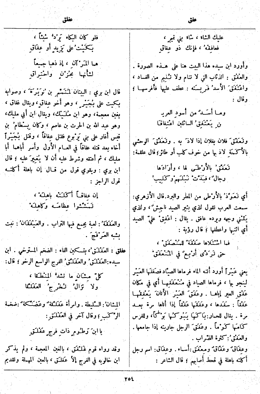 وأَورد ابْنُ سِيدَهْ هَذَا الْبَيْتُ هُنَا عَلَى هَذِهِ الصُّورَةِ. والعُفُق: الذِّئَابُ الَّتِي لَا تَنَامُ وَلَا تُنِيم مِنَ الْفَسَادِ، واعْتَفَقَ الأَسد فَرِيستَه: عَطَفَ عَلَيْهَا فأَفرسها؛ وَقَالَ: