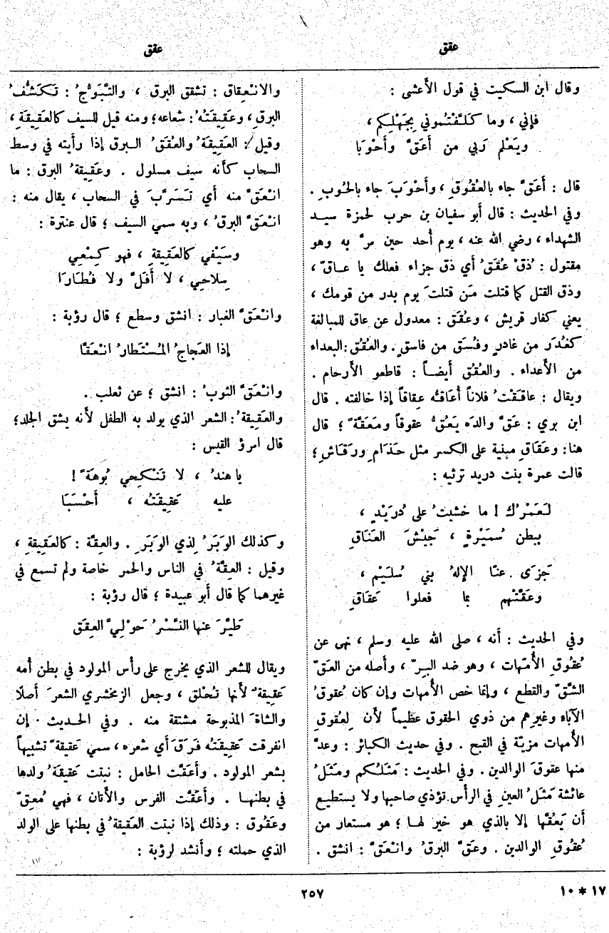 ؛ هُوَ مُسْتَعَارٌ مِنْ عُقُوقِ الْوَالِدَيْنِ. وعَقَّ البرقُ وانْعَقَّ: انْشَقَّ. والانْعِقاق: تَشَقُّقُ الْبَرْقِ، والتَّبَوُّجُ: تَكَشُّفُ البرقِ، وعَقِيقَتُهُ: شُعَاعُهُ؛ وَمِنْهُ قِيلَ لِلسَّيْفِ كالعَقِيقَة، وَقِيلَ: العَقِيقَةُ والعُقَقُ الْبَرْقُ إِذا رأَيته فِي وَسَطِ السَّحَابِ كأَنه سَيْفٌ مَسْلُولٌ. وعَقِيقةُ الْبَرْقِ: مَا انْعَقَّ مِنْهُ أَي تَسَرَّبَ فِي السَّحَابِ، يُقَالُ مِنْهُ: انْعَقَّ البرقُ، وَبِهِ سُمِّيَ السَّيْفُ؛ قَالَ عَنْتَرَةُ: