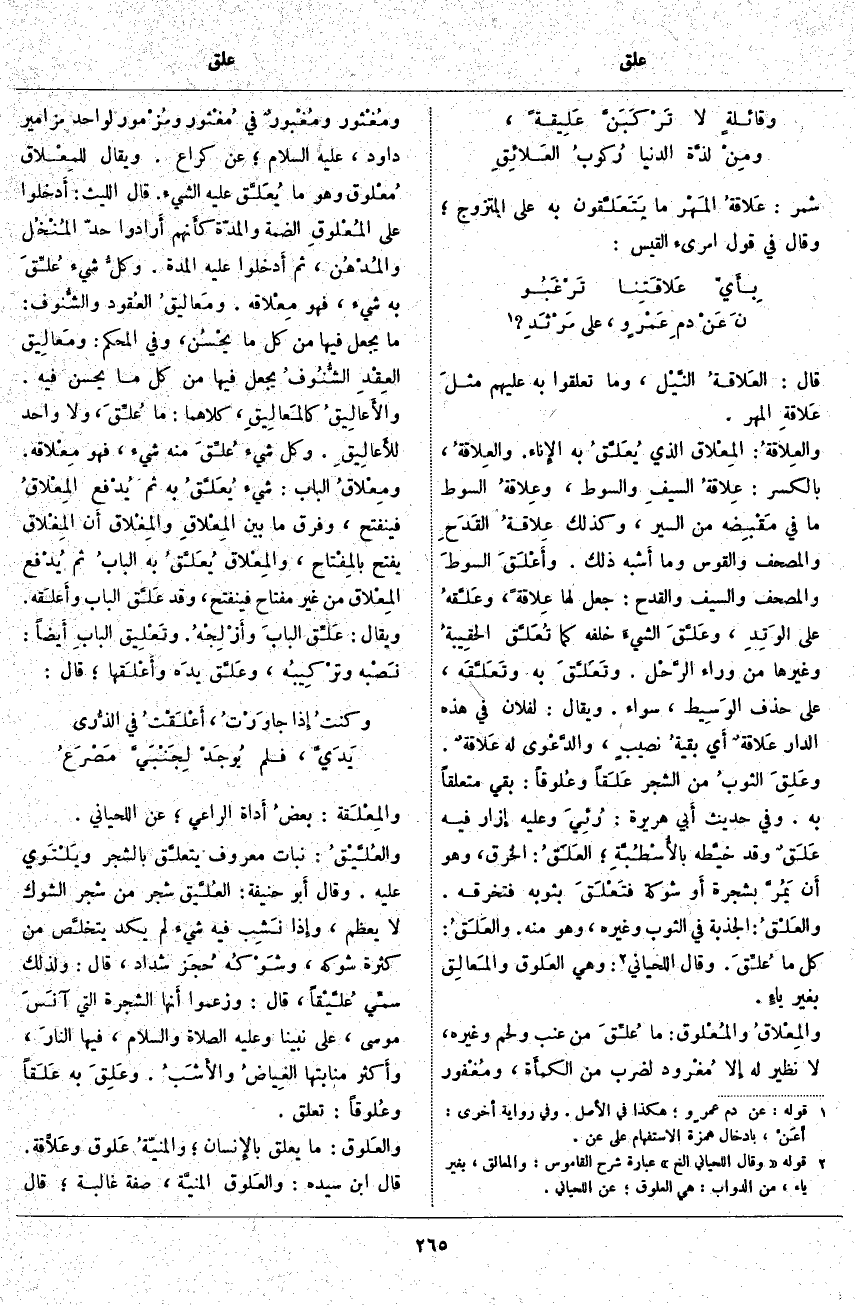 ؛ العَلَقُ: الْخَرْقُ، وَهُوَ أَن يَمُرَّ بِشَجَرَةٍ أَو شَوْكَةٍ فتَعْلَقَ بِثَوْبِهِ فَتَخْرِقُهُ. والعَلْقُ: الْجَذْبَةُ فِي الثَّوْبِ وَغَيْرِهِ، وَهُوَ مِنْهُ. والعَلَقُ: كُلُّ مَا عُلِّقَ. وَقَالَ اللِّحْيَانِيُّ «5»: وَهِيَ العَلوق والمَعالِق بِغَيْرِ ياءٍ. والمِعْلاقُ والمُعْلوق: مَا عُلِّقَ مِنْ عِنَبٍ وَلَحْمٍ وَغَيْرِهِ، لَا نَظِيرَ لَهُ إِلا مُغْرود لِضَرْبٍ مِنَ الكمأَة، ومُغفُور ومُغْثور ومُغْبورٌ فِي مُغْثور ومُزْمور لِوَاحِدِ مَزَامِيرِ دَاوُدَ، عَلَيْهِ السَّلَامُ؛ عَنْ كُرَاعٍ. وَيُقَالُ للمِعْلاق مُعْلوق وَهُوَ مَا يُعَلَّق عَلَيْهِ الشَّيْءُ. قَالَ اللَّيْثُ: أَدخلوا عَلَى المُعلوقِ الضَّمَّةَ وَالْمَدَّةَ كأَنهم أَرادوا حَدَّ المُنْخُل والمُدْهُن، ثُمَّ أَدخلوا عَلَيْهِ الْمَدَّةَ. وكلُّ شَيْءٍ عُلِّقَ بِهِ شَيْءٌ، فَهُوَ مِعْلاقه. ومَعاليقُ العُقود والشُّنوف: مَا يُجْعَلُ فِيهَا مِنْ كُلِّ مَا يحْسُن، وَفِي الْمُحْكَمِ: ومَعالِيق العِقْدِ الشُّنُوفُ يُجْعَلُ فِيهَا من كل ما يحسن فِيهِ. والأَعالِيقُ كالمَعالِيقِ، كِلَاهُمَا: مَا عُلِّقَ، وَلَا وَاحِدَ للأَعالِيقِ. وَكُلُّ شَيْءٍ عُلِّقَ مِنْهُ شَيْءٌ، فَهُوَ مِعْلاقه. ومِعْلاقُ الْبَابِ: شَيْءٌ يُعَلَّقُ بِهِ ثُمَّ يُدْفع المِعْلاقُ فَيَنْفَتِحُ، وَفَرْقُ مَا بَيْنَ المِعْلاقِ والمِغْلاق أنَ المِغْلاق يُفْتَحُ بالمِفْتاح، والمِعْلاق يُعَلَّقُ بِهِ البابُ ثُمَّ يُدْفع المِعْلاق مِنْ غَيْرِ مِفْتَاحٍ فَيَنْفَتِحُ، وَقَدْ عَلَّق الْبَابَ وأَعلَقه. وَيُقَالُ: عَلِّق الْبَابَ وأَزْلِجْهُ. وتَعْلِيق البابِ أَيضاً: نَصْبه وترْكِيبُه، وعَلَّق يدَه وأَعْلَقها؛ قَالَ: