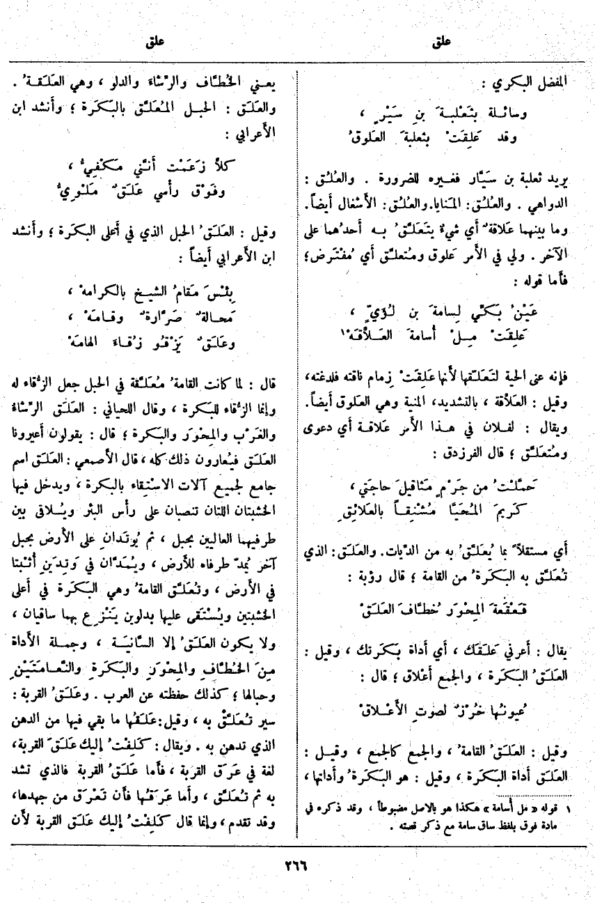 يُرِيدُ ثَعْلَبَةَ بْنَ سَيَّار فَغَيَّرَهُ لِلضَّرُورَةِ. والعُلُق: الدَّوَاهِي. والعُلُق: المَنايا. والعُلُق: الأَشغال أَيضاً. وَمَا بَيْنَهُمَا عَلاقةٌ أَي شيءٌ يتَعَلَّقُ بِهِ أَحدُهما عَلَى الْآخَرِ. وَلِي فِي الأَمر عَلوق ومُتعلَّق أَي مُفْتَرض؛ فأَما قَوْلُهُ: