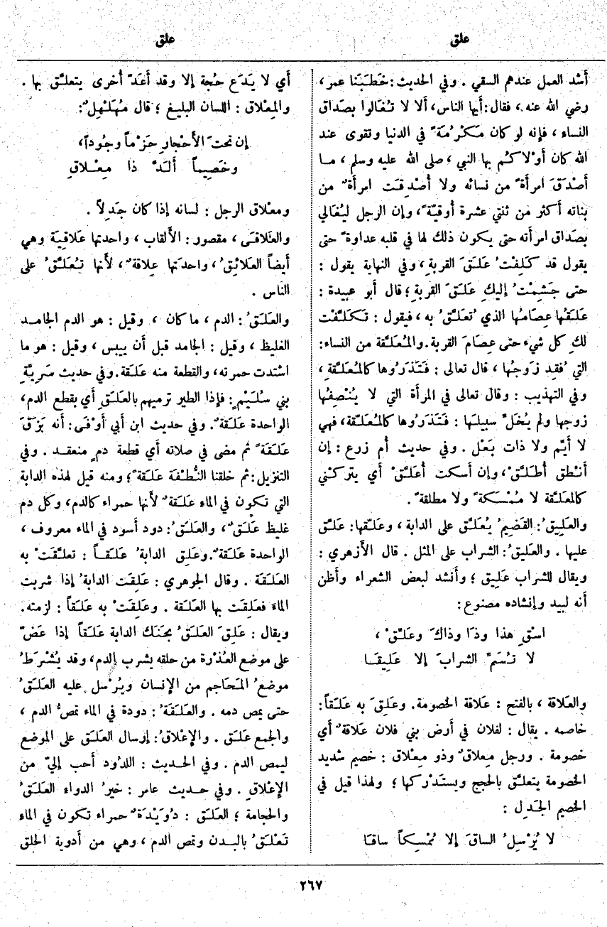 ؛ قَالَ أَبو عُبَيْدَةَ: عَلَقُها عِصَامُها الَّذِي تُعَلَّقُ بِهِ، فَيَقُولُ: تَكَلَّفْت لكِ كُلَّ شَيْءٍ حَتَّى عِصَامَ الْقِرْبَةِ. والمُعَلَّقة مِنَ النِّسَاءِ: الَّتِي فُقِد زَوجُها، قَالَ تَعَالَى: فَتَذَرُوها كَالْمُعَلَّقَةِ