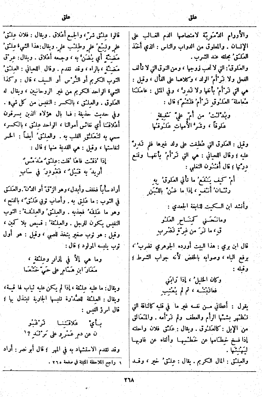 يَقُولُ: أَعطاني مِنْ نَفْسِهِ غَيْرَ مَا فِي قَلْبِهِ كَالنَّاقَةِ الَّتِي تُظْهر بشمِّها الرأْم وَالْعَطْفَ وَلَمْ تَرْأَمه. والمَعَالق مِنَ الإِبل: كالعَلُوق. وَيُقَالُ: عَلَّق فُلَانٌ رَاحِلَتَهُ إِذا فَسَخَ خِطَامها عَنْ خَطْمِها وأَلقاه عَنْ غَارِبِهَا ليَهْنِئَها. والعِلْق: الْمَالُ الْكَرِيمُ. يُقَالُ: عِلْقُ خَيْرٍ، وَقَدْ قَالُوا عِلْق شرٍّ، وَالْجُمَعُ أَعْلاق. وَيُقَالُ: فُلَانٌ عِلْقُ علمٍ وتِبْعُ علمٍ وطلْب علمٍ. وَيُقَالُ: هَذَا الشيءُ عِلْقُ مَضِنَّةٍ أَي يُضَنُّ بِهِ، وَجَمْعُهُ أَعْلاق. وَيُقَالُ: عِرْق مَضِنَّةٍ، بِالرَّاءِ، وَقَدْ تَقَدَّمَ. وَقَالَ اللِّحْيَانِيُّ: العِلْقُ الثَّوْبُ الْكَرِيمُ أَو التُّرْس أَو السَّيْفُ، قَالَ: وَكَذَا الشيءُ الْوَاحِدُ الْكَرِيمُ مِنْ غَيْرِ الرُّوحَانِيِّينَ، وَيُقَالُ لَهُ العَلوق. والعِلْق، بِالْكَسْرِ: النَّفِيسُ مِنْ كُلِّ شيءٍ. وَفِي حَدِيثِ