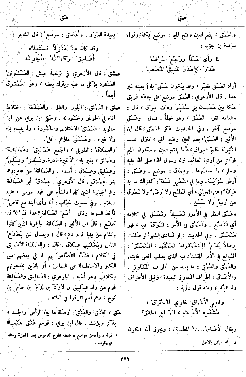 وَيُقَالُ الأَعْماقُ «3» ... الْمُطَمَئِنُّ، وَيَجُوزُ أَن تَكُونَ بَعِيدَةَ الغَوْر. وأُعَامِق: مَوْضِعٌ «4»؛ قَالَ الشَّاعِرُ: