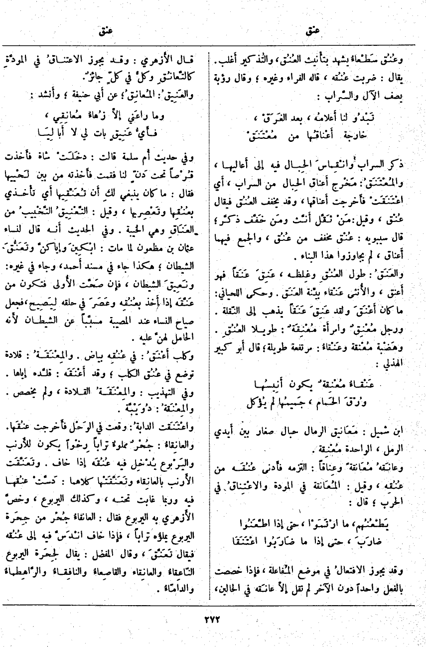 ؛ هَكَذَا جَاءَ فِي مُسْنَدِ أَحمد، وَجَاءَ فِي غَيْرِهِ: ونَعِيقَ الشَّيْطَانِ، فَإِنْ صَحَّت الأُولى فَتَكُونُ مِنْ عَنَّقَه إِذَا أَخذ بعُنُقِه وعَصَرَ فِي حَلْقِهِ لِيَصِيح، فَجَعَلَ صِيَاحَ النِّسَاءِ عِنْدَ الْمُصِيبَةِ مسبَّباً عَنِ الشَّيْطَانِ لأَنه الْحَامِلُ لهنَّ عَلَيْهِ. وَكَلْبٌ أَعْنَقُ: فِي عُنُقِه بَيَاضٌ. والمِعْنَقَةُ: قِلَادَةٌ تُوضَعُ فِي عُنُق الْكَلْبِ؛ وَقَدْ أَعْنَقَه: قلَّده إِيَّاهَا. وَفِي التَّهْذِيبِ: والمِعْنَقَةُ الْقِلَادَةُ، وَلَمْ يُخَصَّصْ. والمِعْنَقةُ: دُوَيبة. واعْتَنَقَت الدابةُ: وَقَعَتْ فِي الوَحْل فَأَخْرَجَتْ عُنقَها. والعانِقاءُ: جُحْرٌ مملوءٌ تُرَابًا رِخْواً يَكُونُ للأَرنب واليَرْبوع يُدْخِل فِيهِ عُنُقَه إِذَا خَافَ. وتَعَنَّقَت الأَرنب بالعانِقاء وتَعَنَّقَتْها كِلَاهُمَا: دَسَّتْ عُنقها فِيهِ وَرُبَّمَا غَابَتْ تَحْتَهُ، وَكَذَلِكَ الْيَرْبُوعُ، وخصَّ الأَزهري بِهِ الْيَرْبُوعَ فَقَالَ: العانقاءُ جُحْر مِنْ جِحَرة الْيَرْبُوعِ يَمْلَؤُهُ تُرَابًا، فَإِذَا خَافَ انْدَسَّ فِيهِ إِلَى عُنُقه فَيُقَالُ تَعَنَّقَ، وَقَالَ الْمُفَضَّلُ: يُقَالُ لجِحَرة الْيَرْبُوعِ النّاعِقاءُ والعانِقاء والقاصِعاءُ والنافِقاءُ والرَّاهِطاءُ والدامّاءُ.
