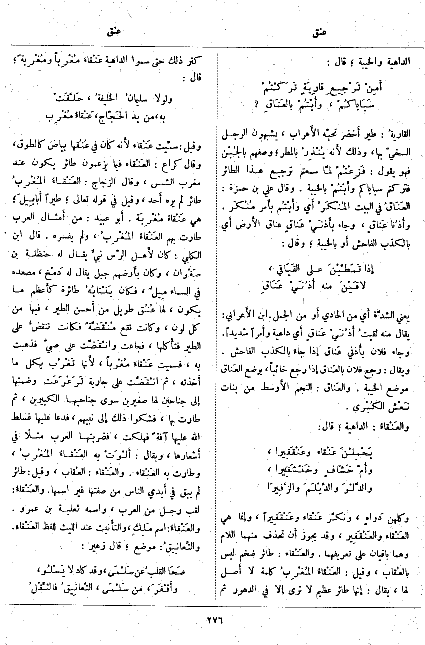 وَكُلُّهُنَّ دَواهٍ، ونكَّر عَنْقاء وعَنْقَفِيراً، وَإِنَّمَا هِيَ العَنْقاء والعَنْقَفِير، وَقَدْ يَجُوزُ أَنْ تُحْذَفَ مِنْهُمَا اللَّامُ وَهُمَا بَاقِيَانِ عَلَى تَعْرِيفِهِمَا. والعَنْقاء: طَائِرٌ ضَخْمٌ لَيْسَ بالعُقاب، وَقِيلَ: العَنْقاءُ المُغْرِبُ كَلِمَةٌ لَا أَصل لَهَا، يُقَالُ: إِنَّهَا طَائِرٌ عَظِيمٌ لَا تُرَى إِلَّا فِي الدُّهُورِ ثُمَّ كَثُرَ ذَلِكَ حَتَّى سُمُّوا الدَّاهِيَةَ عَنْقاء مُغْرِباً ومُغْرِبةً؛ قَالَ: