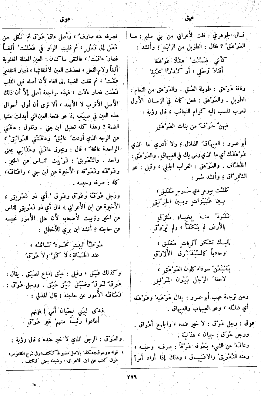 عوق: رَجُلٌ عَوْق: لَا خَيْرَ عِنْدَهُ، وَالْجَمْعُ أَعْواق. وَرَجُلٌ عُوَق: جَبَانٌ، هذَليَّة. وعاقَهُ عَنِ الشَّيْءِ يَعُوقه عَوْقاً: صَرَفَهُ وَحَبَسَهُ، وَمِنْهُ التَّعْويقُ والاعْتِياق، وَذَلِكَ إِذا أَراد أَمراً فَصَرَفَهُ عَنْهُ صارفٌ، وأَصل عاقَ عَوَق ثُمَّ نُقل مِنْ فَعَل إِلى فَعُلٍ، ثم قلبت الْوَاوُ فِي فَعُلْتُ أَلِفاً فصارَ عاقْتُ، فَالْتَقَى سَاكِنَانِ: الْعَيْنُ الْمُعْتَلَّةُ الْمَقْلُوبَةُ أَلِفاً وَلَامُ الْفِعْلِ، فَحُذِفَتِ الْعَيْنُ لِالْتِقَائِهِمَا، فَصَارَ التَّقْدِيرُ عَقْتُ، ثُمَّ نُقِلَتِ الضَّمَّةُ إِلى الْفَاءِ لأَن أَصله قَبْلَ الْقَلْبِ فَعُلت فَصَارَ عُقْت، فَهَذِهِ مُرَاجَعَةُ أَصل إِلَّا أَن ذَلِكَ الأَصل الأَقرب لَا الأَبعد، أَلا تَرَى أَن أَول أَحوال هَذِهِ الْعَيْنِ فِي صِيَغِه إِنما هُوَ فَتْحَةُ الْعَيْنِ الَّتِي أُبدلت مِنْهَا الضَّمَّةُ؟ وَهَذَا كُلُّهُ تَعْلِيلُ ابْنِ جِنِّي. وَتَقُولُ: عاقَني عَنِ الْوَجْهِ الَّذِي أَردتُ عائِقٌ وعاقَتْني العَوائِقُ، الْوَاحِدَةُ عائقةٌ، قَالَ: وَيَجُوزُ عاقَني وعَقانِي بِمَعْنًى وَاحِدٍ. والتَّعْويقُ: تَرْبيث النَّاسِ عَنِ الْخَيْرِ. وعَوَّقَه وتَعَوَّقه؛ الأَخيرة عَنِ ابْنِ جِنِّي، واعْتاقَه، كُلَّهُ: صَرَفَهُ وَحَبَسَهُ. وَرِجْلٌ عُوَقَة وعُوَق وعَوِق «2». أَي ذُو تَعْوِيقٍ؛ الأَخيرة عَنِ ابْنِ الأَعرابي، قَالَ أَي ذُو تَعْويقٍ لِلنَّاسِ عَنِ الْخَيْرِ وَتَرْبِيثٍ لأَصحابه لأَن عِلَلَ الأُمور تَحْبِسُهُ عَنْ حَاجَتِهِ؛ أَنشد ابْنُ بَرِّيٍّ للأَخطل:
