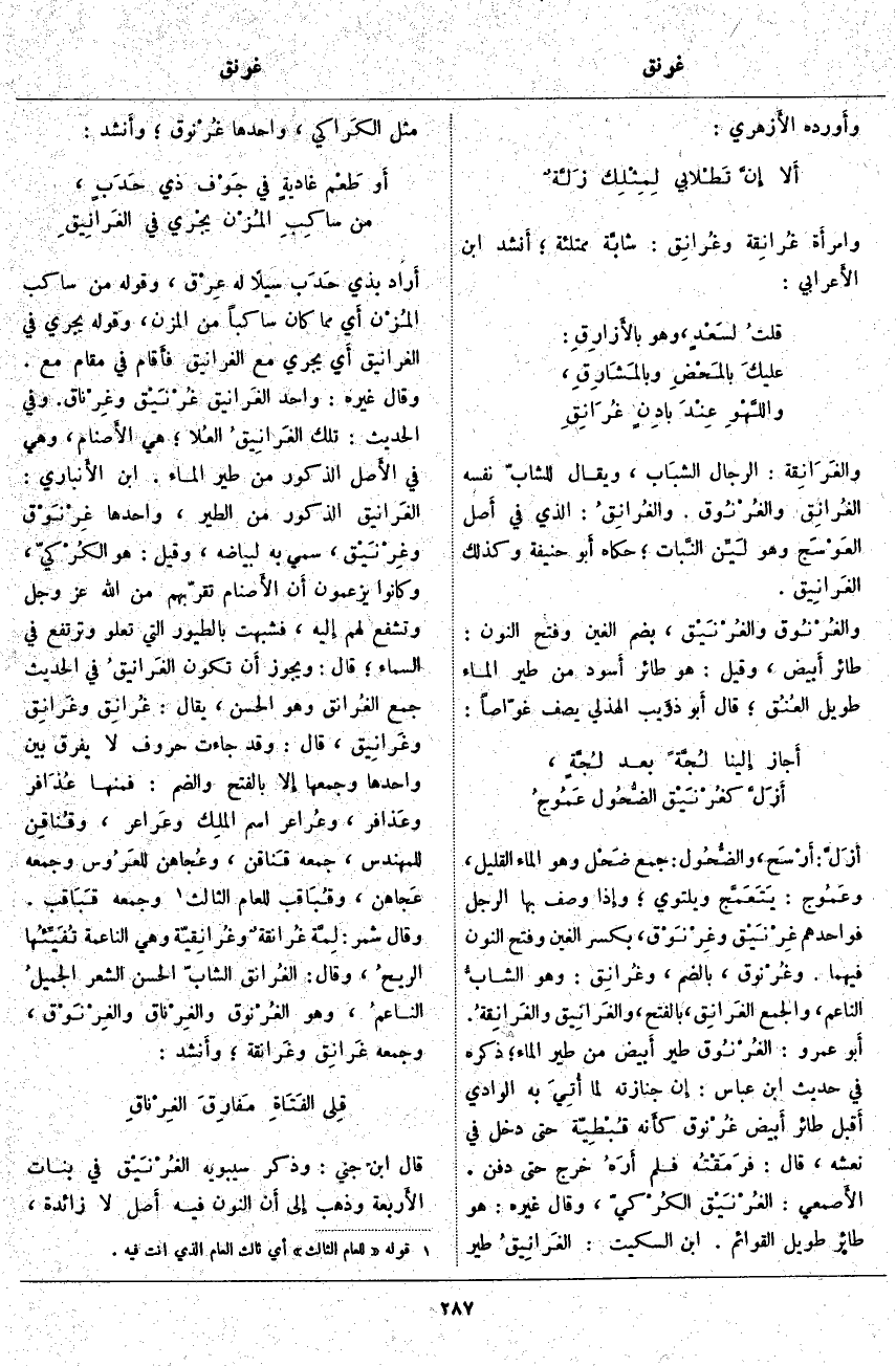 ؛ هِيَ الأَصنام، وَهِيَ فِي الأَصل الذُّكُورُ مِنْ طَيْرِ الْمَاءِ. ابْنُ الأَنباري: الْغَرَانِيقُ الذُّكُورُ مِنَ الطَّيْرِ، وَاحِدُهَا غِرْنَوْق وغِرْنَيْق، سُمِّيَ بِهِ لِبَيَاضِهِ، وَقِيلَ: هُوَ الكُرْكيّ، وَكَانُوا يَزْعُمُونَ أَنَّ الأَصنام تُقَرِّبُهُمْ مِنَ اللَّهِ عَزَّ وَجَلَّ وَتَشْفَعُ لَهُمْ إِلَيْهِ، فَشُبِّهَتْ بِالطُّيُورِ الَّتِي تَعْلُو وَتَرْتَفِعُ فِي السَّمَاءِ؛ قَالَ: وَيَجُوزُ أَنْ تَكُونَ الغَرانيقُ فِي الْحَدِيثِ جَمْعُ الغُرانق وَهُوَ الْحَسَنُ، يُقَالُ: غُرانِق وغَرانِق وغَرانِيق، قَالَ وَقَدْ جَاءَتْ حُرُوفٌ لَا يُفْرَقُ بَيْنَ وَاحِدِهَا وَجَمْعِهَا إِلَّا بِالْفَتْحِ وَالضَّمِّ: فَمِنْهَا عُذَافر وعَذافر، وعُراعر اسْمُ الملِك وعَراعر، وقُناقِن لِلْمُهَنْدِسِ، جَمْعُهُ قَناقن، وعُجاهن للعَرُوس وَجَمْعُهُ عَجاهن، وقُبَاقب لِلْعَامِ الثَّالِثِ «4». وَجَمْعُهُ قَبَاقب. وَقَالَ شَمِرٌ: لِمَّة غُرانقةٌ وغُرانِقيّة وَهِيَ النَّاعِمَةُ تُفَيِّئُها الريحُ، وَقَالَ: الغُرانق الشَّابُّ الْحَسَنُ الشَّعَرِ الجميلُ الناعمُ، وَهُوَ الغُرْنوق والغِرْناق والغِرْنَوْق، وَجَمْعُهُ غَرانِق وغَرانقة؛ وأَنشد:
