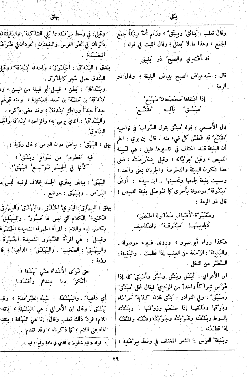 هَكَذَا رَوَاهُ أَبو عَمْرٍو، وَرَوَى غَيْرُهُ مَوْصُولَةٌ. والبَنِيقةُ: الزَّمَعة مِنَ العِنب إِذا عَظُمَتْ. والبَنِيقة: السَّطْر مِنَ النَّخْلِ. ابْنُ الأَعرابي: أَبْنَق وبَنَّق ونَبَّق وأنْبَقَ كُلَّهُ إِذَا غَرَسَ شِراكاً وَاحِدًا مِنَ الوَدِيّ فَيُقَالُ نَخْلٌ مُبَنَّقٌ ومنَبَّقٌ. وَفِي النَّوَادِرِ: بَنَّق فُلَانٌ كِذْبةً حَرْشاء وبَوَّقها وبَلَّقها إِذَا صنَعَها وزوَّقَها. وبَنَّقْته بِالسَّوْطِ وبَلَّقْته وقَوَّبْتُه وجَوَّبْتُه وفتَّقْته وفلَّقْتُه إِذَا قطَّعْته. وبَنيقةُ الْفَرَسِ: الشَّعْرُ الْمُخْتَلِفُ فِي وَسَطِ مِرْفَقِه، وَقِيلَ: فِي وَسَطِ مِرْفَقه مِمَّا يَلي الشاكِلةَ. والبَنيقتانِ: دائرتانِ فِي نَحْر الْفَرَسِ. والبنيقتانِ: عُودان فِي طَرَفَي المِضْمَدةِ.