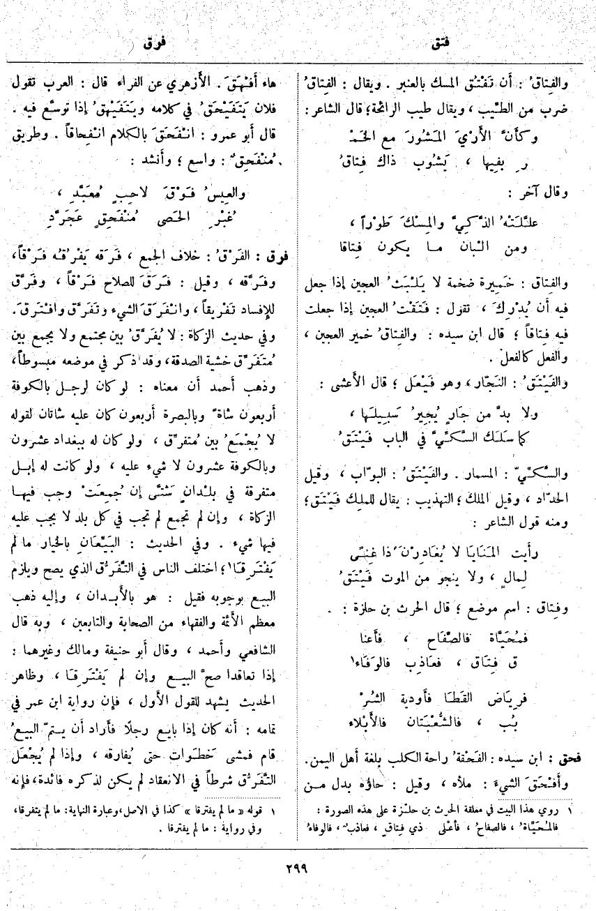 فحق: ابْنُ سِيدَهْ: الفَحْقةُ رَاحَةُ الْكَلْبِ بِلُغَةِ أَهل الْيَمَنِ. وأَفْحَقَ الشيءَ: ملأَه، وَقِيلَ؛ حاؤُه بَدَلٌ مِنْ هَاءِ أَفْهَقَ. الأَزهري عَنِ الْفَرَّاءِ قَالَ: الْعَرَبُ تَقُولُ فُلَانٌ يَتَفَيْحَقُ فِي كَلَامِهِ ويَتَفَيْهقُ إِذا توسَّع فِيهِ. قَالَ أَبو عَمْرٍو: انْفَحَقَ بِالْكَلَامِ انْفِحاقاً. وَطَرِيقٌ مُنْفَحِقٌ: وَاسِعٌ؛ وأَنشد: