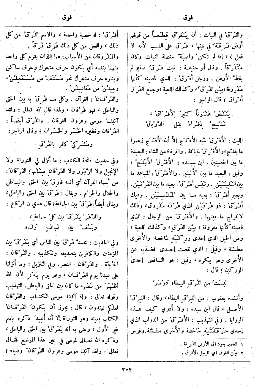 وأَنشده يَعْقُوبُ: مِنَ القِرْقِ الْبِطَاءِ، وَقَالَ: القِرْقُ الأَصل، قَالَ ابْنُ سِيدَهْ: وَلَا أَدري كَيْفَ هَذِهِ الرِّوَايَةُ. وَفِي التَّهْذِيبِ: الأَفْرَقُ مِنَ الدَّوَابِّ الَّذِي إِحدى حَرْقَفَتَيْهِ شَاخِصَةٌ والأُخرى مُطْمَئِنَّةٌ. وَفَرَسٌ أَفْرَقُ: لَهُ خُصْيَةٌ وَاحِدَةٌ، وَالِاسْمُ الفَرَقُ مِنْ كُلِّ ذَلِكَ، وَالْفِعْلُ مِنْ كُلِّ ذَلِكَ فَرِقَ فَرَقاً. والمَفْروقان مِنَ الأَسباب: هُمَا اللَّذَانِ يَقُومُ كُلُّ وَاحِدٍ مِنْهُمَا بِنَفْسِهِ أَي يَكُونُ حَرْفٌ مُتَحَرِّكٌ وَحَرْفٌ سَاكِنٌ وَيَتْلُوهُ حَرْفٌ مُتَحَرِّكٌ نَحْوَ مُسْتَفْ مِنْ مُسْتَفْعِلُنْ، وعِيلُنْ مِنْ مَفاعِيلُنْ. والفُرْقانُ: الْقُرْآنُ. وَكُلُّ مَا فُرِقَ بِهِ بَيْنَ الْحَقِّ وَالْبَاطِلِ، فَهُوَ فُرْقان، وَلِهَذَا قَالَ اللَّهُ تَعَالَى: وَلَقَدْ آتَيْنا مُوسى وَهارُونَ الْفُرْقانَ