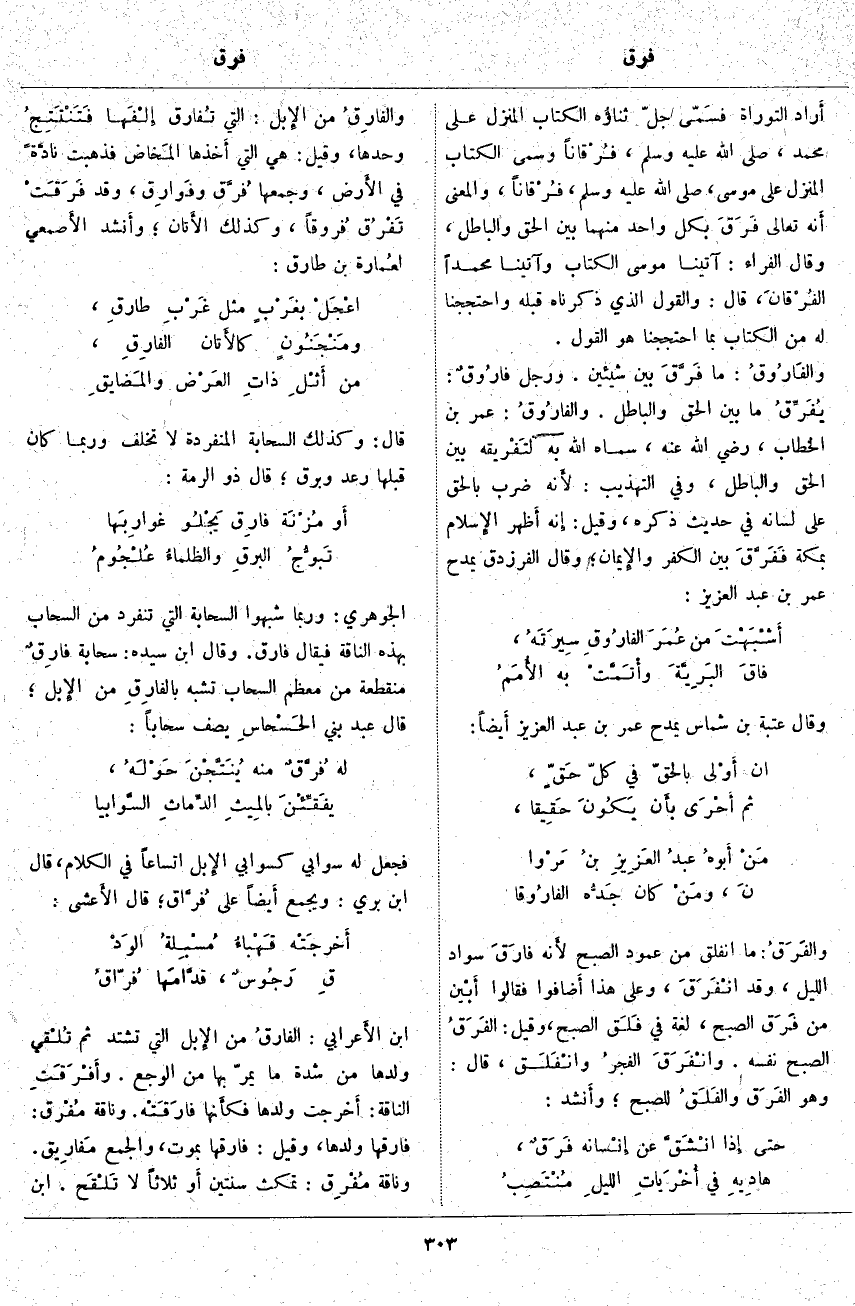 أَراد التَّوْرَاةَ فسَمّى جَلَّ ثَنَاؤُهُ الْكِتَابَ الْمُنَزَّلَ عَلَى مُحَمَّدٍ، صَلَّى اللَّهُ عَلَيْهِ وَسَلَّمَ، فُرْقاناً وَسَمَّى الْكِتَابَ الْمُنَزَّلَ على مُوسَى، صَلَّى اللَّهُ عَلَيْهِ وَسَلَّمَ، فُرْقاناً، وَالْمَعْنَى أَنه تَعَالَى فَرَقَ بِكُلِّ وَاحِدٍ مِنْهُمَا بَيْنَ الْحَقِّ وَالْبَاطِلِ، وَقَالَ الْفَرَّاءُ: آتَيْنَا مُوسَى الْكِتَابَ وَآتَيْنَا مُحَمَّدًا الفُرْقانَ، قَالَ: وَالْقَوْلُ الَّذِي ذَكَرْنَاهُ قَبْلَهُ وَاحْتَجَجْنَا لَهُ مِنَ الْكِتَابِ بِمَا احْتَجَجْنَا هُوَ الْقَوْلُ. والفَارُوقُ: مَا فَرَّقَ بَيْنَ شَيْئَيْنِ. وَرَجُلٌ فارُوقٌ: يُفَرِّقُ مَا بَيْنَ الْحَقِّ وَالْبَاطِلِ. والفارُوقُ: عُمَرُ بْنُ الْخَطَّابِ، رَضِيَ الله عنه، سماه الله بِهِ لتَفْريقه بَيْنَ الْحَقِّ وَالْبَاطِلِ، وَفِي التَّهْذِيبِ: لأَنه ضَرَبَ بِالْحَقِّ عَلَى لِسَانِهِ فِي حَدِيثٍ ذَكَرَهُ، وَقِيلَ: إِنه أَظهر الإِسلام بِمَكَّةَ فَفَرَّقَ بَيْنَ الْكُفْرِ والإِيمان؛ وَقَالَ الْفَرَزْدَقُ يَمْدَحُ عُمَرَ بْنَ عَبْدِ الْعَزِيزِ: