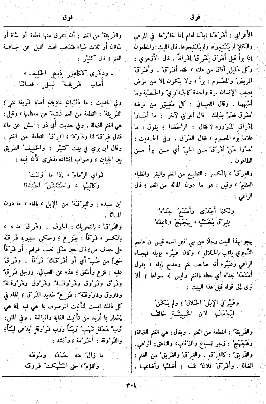 والفَريقةُ: الْقِطْعَةُ مِنَ الْغَنَمِ. وَيُقَالُ: هِيَ الْغَنَمُ الضَّالَّةُ؛ وهَجْهَجْ: زَجْرٌ لِلسِّبَاعِ والذِّئاب، وَالنَّاعِقُ: الرَّاعِي. والفَريقُ: كالفِرْقِ. والفِرْقُ والفَريقُ مِنَ الْغَنَمِ: الضَّالَّةُ. وأَفْرَقَ فلانٌ غَنَمَهُ: أَضلَّها وأَضاعها. والفَريقةُ مِنَ الْغَنَمِ: أَن تَتَفَرَّقَ مِنْهَا قِطْعَةٌ أَو شَاةٌ أَو شَاتَانِ أَو ثَلَاثُ شِيَاهٍ فَتَذْهَبَ تَحْتَ اللَّيْلِ عَنْ جَمَاعَةِ الْغَنَمِ؛ قَالَ كثيِّر: