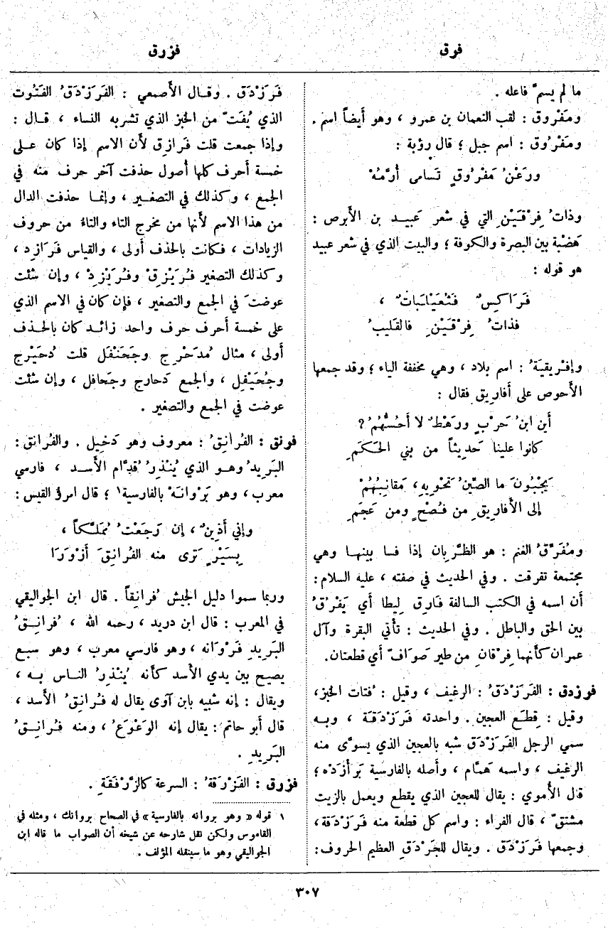 فرنق: الفُرانِقُ: مَعْرُوفٌ وَهُوَ دَخِيل. والفُرانق: البَرِيدُ وَهُوَ الَّذِي يُنْذِرُ قُدَّام الأَسد، فَارِسِيٌّ مُعَرَّبٌ، وَهُوَ بَرْوانَهْ بِالْفَارِسِيَّةِ «1»؛ قَالَ إِمرؤ الْقَيْسِ: