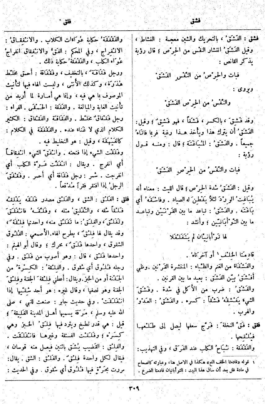 فشق: الفَشَقُ، بِالتَّحْرِيكِ وَالشِّينِ مُعْجَمَةً: النَّشَاطُ، وَقِيلَ الفَشَقُ انْتِشَارُ النفْس مِنَ الحِرْص؛ قَالَ رُؤْبَةُ يَذْكُرُ الْقَانِصَ: