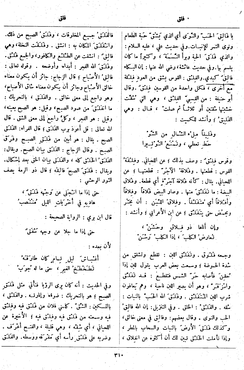 ؛ هُوَ بِالتَّحْرِيكِ: ضوءُه وإِنارته. والفَلْق، بِالتَّسْكِينِ: الشَّقّ. كَلَّمَنِي فُلَانٌ مِنْ فَلْق فِيهِ وفِلْق فِيهِ وَسَمِعْتُهُ مِنْ فَلْق فِيهِ وفِلْق فِيهِ؛ الأَخيرة عَنِ اللِّحْيَانِيِّ، أَي شِقِّه، وَهِيَ قَلِيلَةٌ، وَالْفَتْحُ أَعْرَف. وَضَرَبَهُ عَلَى فَلْقِ رأْسه أَي مَفْرَقه وَوَسَطِهِ. والفَلَق