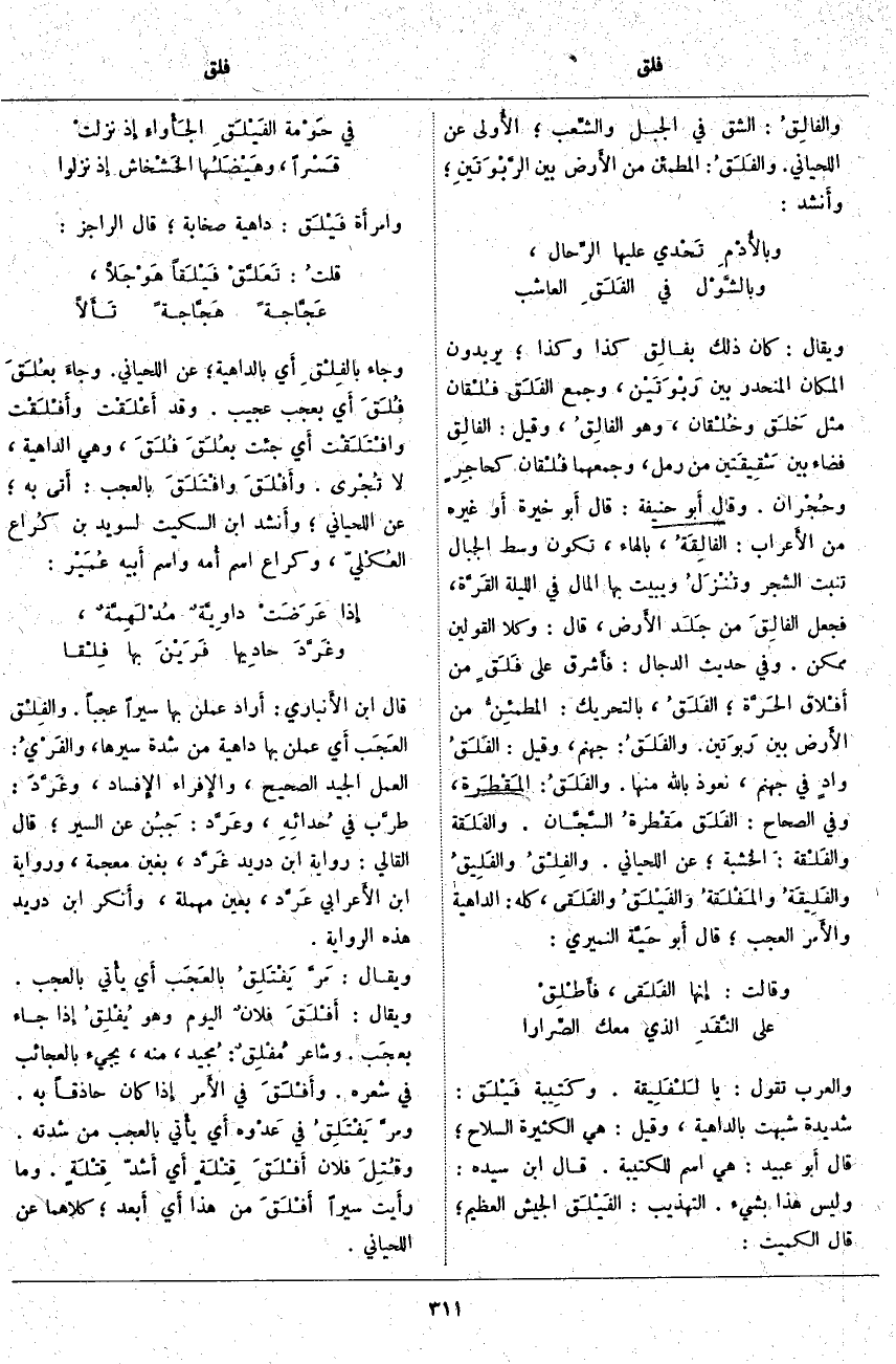؛ الفَلَقُ، بِالتَّحْرِيكِ: المطمئِنُّ مِنَ الأَرض بَيْنَ رَبوَتَين. والفَلَقُ: جَهَنَّمُ، وَقِيلَ: الفَلَقُ وادٍ فِي جَهَنَّمَ، نَعُوذُ بِاللَّهِ مِنْهَا. والفَلَقُ: المَقْطَرة، وَفِي الصِّحَاحِ: الفَلَق مَقْطرةُ السَّجَّان. والفَلَقة والفَلْقة: الْخَشَبَةُ؛ عَنِ اللِّحْيَانِيِّ. والفِلْقُ والفَلِيقُ والفَلِيقَةُ والْمَفْلَقَةُ الفَيْلَقُ والفَلَقى، كُلُّهُ: الدَّاهِيَةُ والأَمر الْعَجَبُ؛ قَالَ أَبو حَيَّة النُّمَيْرِيُّ: