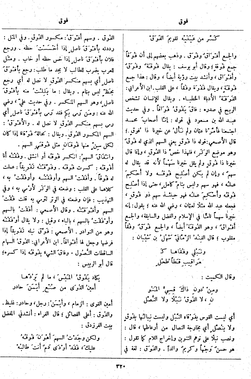 أَيْ قَسَّمَهَا فِي قَدْرِ فُواقِ ناقةٍ، وَهُوَ قَدْرُ ما بين الحلبتين من الرَّاحَةِ، تُضَمُّ فَاؤُهُ وَتُفْتَحُ، وَقِيلَ: أَرَادَ التَّفْضِيلَ فِي الْقِسْمَةِ كَأَنَّهُ جَعَلَ بَعْضَهُمْ أفْوقَ مِنْ بعضٍ عَلَى قَدْرِ غَنائهم وبَلائهم، وَعَنْ هَاهُنَا بِمَنْزِلَتِهَا فِي قَوْلِكَ أَعْطَيْتُهُ عَنْ رَغْبَةٍ وطِيبِ نَفْسٍ، لأَن الْفَاعِلَ وَقْتَ إِنْشَاءِ الْفِعْلِ إِذَا كَانَ مُتَّصِفًا بِذَلِكَ كَانَ الْفِعْلُ صَادِرًا عَنْهُ لَا مَحَالَةَ وَمُجَاوِزًا لَهُ؛ وَقَالَ ابْنُ سِيدَهْ فِي الْحَدِيثِ: أَرَادُوا التَّفْضِيلَ وَأَنَّهُ جَعَلَ بَعْضَهُمْ فِيهَا فَوْق بَعْضٍ عَلَى قَدْرِ غِنَائِهِمْ يَوْمَئِذٍ؛ وَفِي التَّهْذِيبِ: كَأَنَّهُ أَرَادَ فَعَل ذَلِكَ فِي قَدْرِ فُواق نَاقَةٍ، وَفِيهِ لُغَتَانِ: مِنْ فَواق وفُواق. وفاقَ الرَّجُلُ صَاحِبَهُ: عَلَاهُ وَغَلَبَهُ وفَضَلَهُ. وفاقَ الرَّجُلُ أَصْحَابَهُ يَفُوقهم أَيْ عَلَاهُمْ بِالشَّرَفِ. وَفِي الْحَدِيثِ