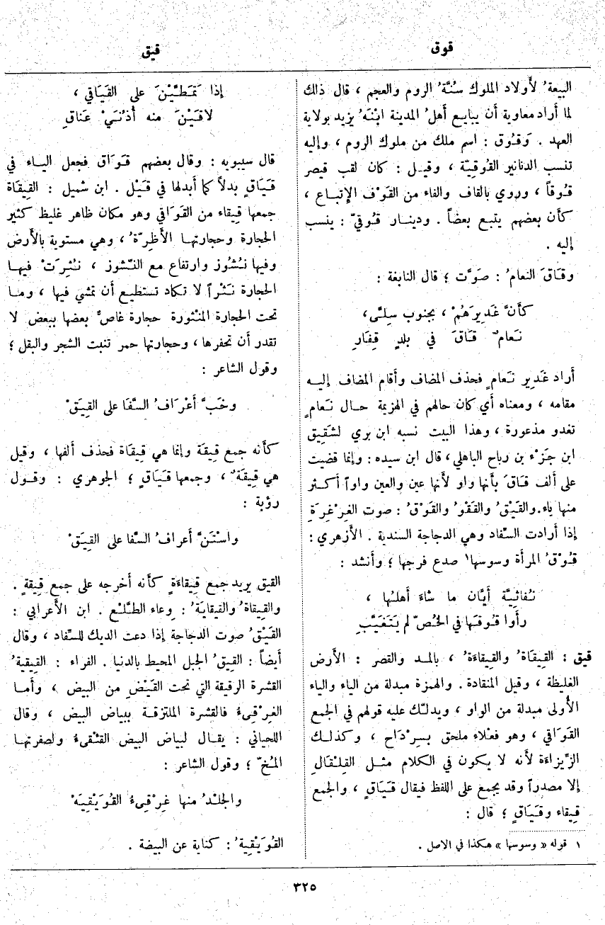 وَقَالَ: هَكَذَا أَنْشَدَنِيهِ الْمُفَضَّلُ، وَقَالَ: إِيَّاكَ وَهَؤُلَاءِ الَّذِينَ يَرْوُونَهُ فُوقَة؛ قَالَ أَبُو الْهَيْثَمِ: يُقَالُ شَنَّة وشِنان وشَنّ وشِنَان، وَيُقَالُ: رَمَيْنَا فُوقاً وَاحِدًا، وَهُوَ أَنْ يَرْمِيَ الْقَوْمُ الْمُجْتَمِعُونَ رَمْيَةً بِجَمِيعِ مَا مَعَهُمْ مِنَ السِّهَامِ، يَعْنِي يَرْمِي هَذَا رَمْيَةً وَهَذَا رَمْيَةً. وَالْعَرَبُ تَقُولُ: أقْبِلْ عَلَى فُوقِ نَبْلك أَيْ أقْبِلْ عَلَى شَأْنِكَ وَمَا يَعْنِيكَ. النَّضْرُ: فُوقُ الذَّكَرِ أَعْلَاهُ، يُقَالُ: كَمَرَةٌ ذَاتُ فُوقٍ؛ وَأَنْشَدَ: