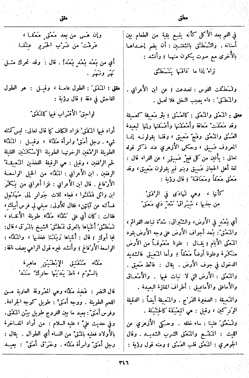 معق: المَعْق والمُعْق: كالعُمْق؛ بِئْرٌ مَعِيقة كَعَمِيقَةٍ وَقَدْ مَعُقَتْ مَعاقة وأَمْعَقْتها وأَعْمَقتها وَإِنَّهَا لَبَعِيدَةُ العُمْق والمْعق وفَجّ مَعِيق، وَقَلَّمَا يَقُولُونَهُ إِنَّمَا الْمَعْرُوفُ عَمِيق، وَحَكَى الأَزهري عِنْدَ ذِكْرِ قَوْلِهِ تَعَالَى: يَأْتِينَ مِنْ كُلِّ فَجٍّ عَمِيقٍ، عَنِ الْفَرَّاءِ قَالَ: لُغَةُ أَهل الْحِجَازِ عَمِيق وَبَنُو تَمِيمٍ يَقُولُونَ مَعِيق، وَقَدْ مَعُق مَعْقاً ومَعَاقةً؛ قَالَ رُؤْبَةُ: