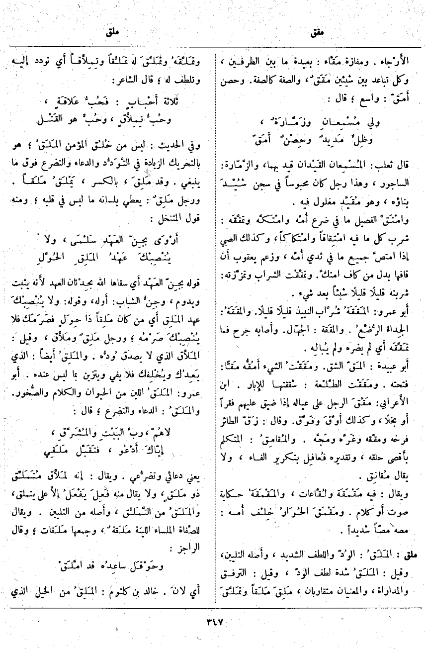 ملق: المَلَقُ: الوُدّ وَاللُّطْفُ الشَّدِيدُ، وأَصله التَّلْيِينُ وَقِيلَ: المَلَقُ شِدَّةُ لُطْفِ الْوُدِّ، وَقِيلَ: التَّرَفُّقُ وَالْمُدَارَاةُ، وَالْمَعْنَيَانِ مُتَقَارِبَانِ، مَلِقَ مَلَقاً وتمَلَّقَ وتَملَّقَهُ وتمَلّقَ لَهُ تمَلُّقاً وتِمِلَّاقاً أَي تَوَدَّدَ إِلَيْهِ وَتَلَطَّفَ لَهُ: قَالَ الشَّاعِرُ: