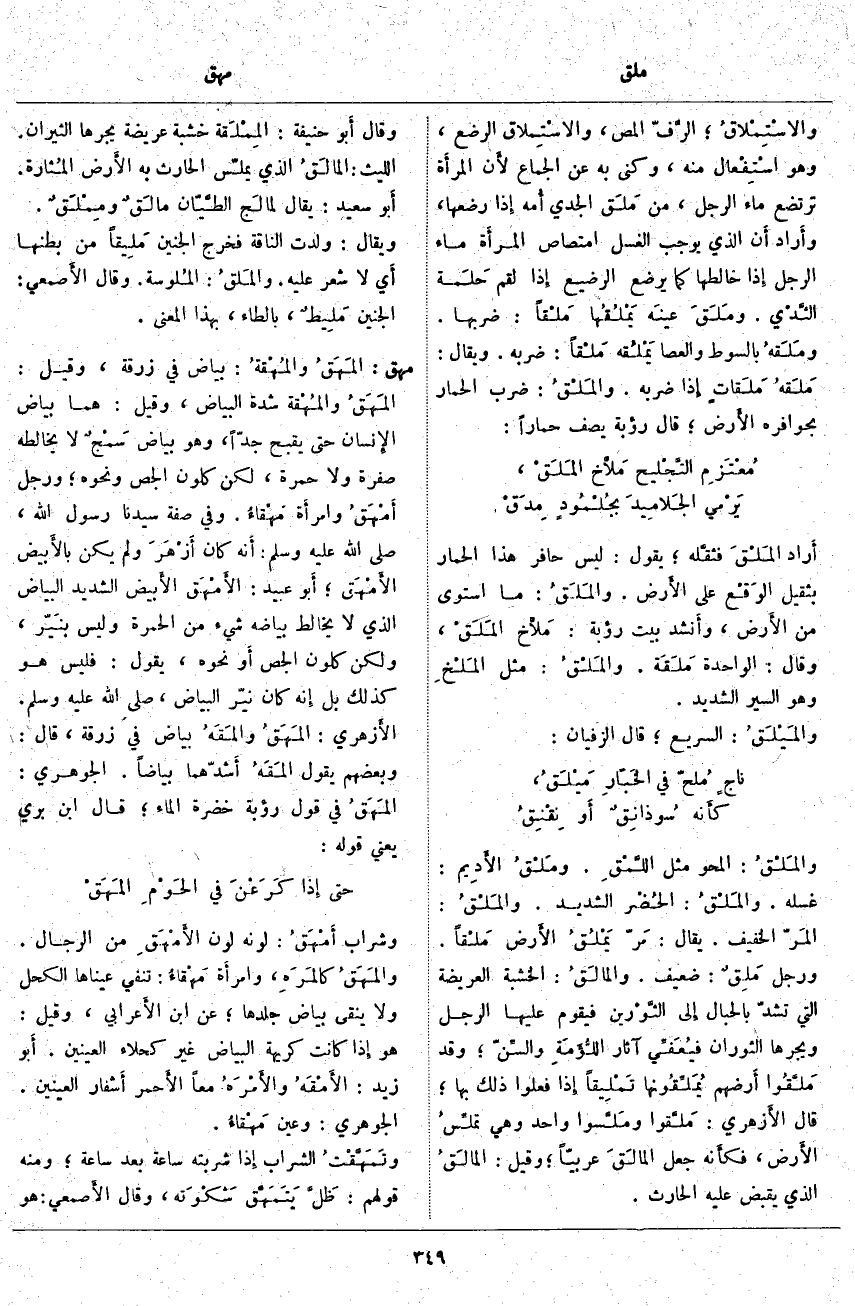 مهق: المَهَقُ والمُهْقةُ: بَيَاضٌ فِي زُرْقَةٍ، وَقِيلَ المَهَقُ والمُهْقة شِدَّةُ الْبَيَاضِ، وَقِيلَ: هُمَا بَيَاضُ الإِنسان حَتَّى يَقْبَحَ جِدًّا، وَهُوَ بَيَاضٌ سَمْجٌ لَا يُخَالِطُهُ صُفْرَةٌ وَلَا حُمْرَةٌ، لَكِنْ كَلَوْنِ الْجِصِّ وَنَحْوِهِ؛ وَرَجُلٌ أَمْهَقُ وامرأَة مَهْقاءُ.