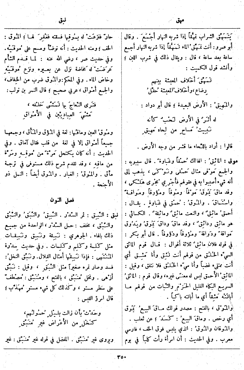 موق: المائقُ: الْهَالِكُ حُمْقاً وغَباوةً. قَالَ سِيبَوَيْهِ: وَالْجَمْعُ مَوْقى مِثَالُ حَمْقى ونَوْكَى، يَذْهَبُ إِلَى أَنَّهُ شَيْءٌ أُصيبوا بِهِ فِي عُقُولِهِمْ فأُجْري مُجْرَى هَلْكى، وَقَدْ ماقَ يَمُوقُ مَوْقاً ومُوقاً ومُؤُوقاً ومَواقةً واسْتَماقَ. والمُوقُ: حُمْق فِي غَباوةٍ. يُقَالُ: أحمقُ مائقٌ، وَالنَّعْتُ مائقٌ ومائِقةٌ. الْكِسَائِيُّ: هُوَ مائِق ودائِق، وَقَدْ ماقَ وداقَ يَمُوقُ ويَدُوق مَواقةً ودَواقةً ومُؤوقاً ودُؤُوقاً. قَالَ أَبُو بَكْرٍ: فِي قَوْلِهِ فُلَانٌ مائقٌ ثَلَاثَةُ أَقْوَالٍ: قَالَ قَوْمٌ المائق السيِء الخُلُق مِنْ قَوْلِهِمْ أَنت تَئِق وَأَنَا مَئِق أَيْ أَنْتَ مُمْتَلِئٌ غَضَبًا وَأَنَا سيّء الخُلُق فَلَا نَتَّفِقُ، وَقِيلَ: المائِقُ الأَحمق لَيْسَ لَهُ مَعْنًى غَيْرَهُ، وَقَالَ قَوْمٌ: المائقُ السَّرِيعُ الْبُكَاءِ الْقَلِيلُ الحَزْمِ والثَّبات مِنْ قَوْلِهِمْ مَا أَباتَتْه مَئِقاً أَيْ مَا أَبَاتَتْهُ بَاكِيًا. والمَوْق، بِالْفَتْحِ: مَصْدَرُ قَوْلِكَ ماقَ البيعُ يَمُوق أَي رَخُصَ. وماقَ البيعُ: كَسَدَ؛ عَنْ ثَعْلَبٍ. والمُوقان والمُوقُ: الَّذِي يُلْبَسُ فَوْقَ الْخُفِّ، فَارِسِيٌّ مُعَرَّبٌ. وَفِي الْحَدِيثِ: