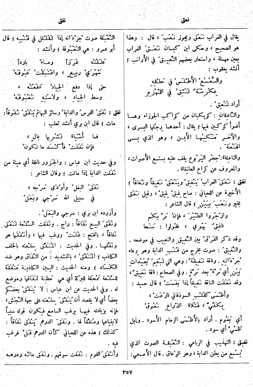 نفق: نَفَقَ الفرسُ والدابةُ وَسَائِرُ الْبَهَائِمِ يَنْفُقُ نُفُوقاً: مات؛ قَالَ ابْنُ بَرِّيٍّ أَنشد ثَعْلَبٌ: