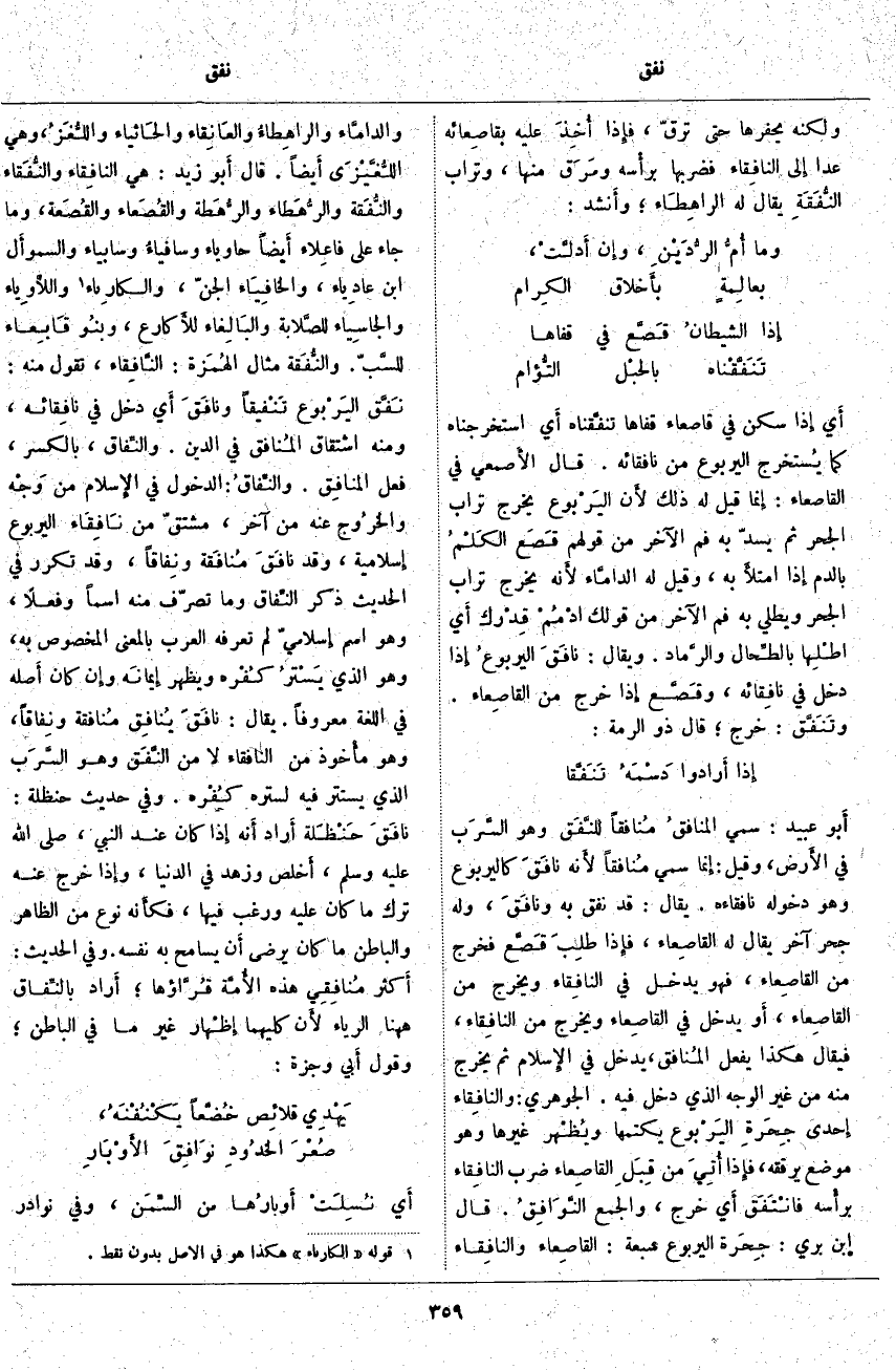أَبو عُبَيْدٍ: سُمِّيَ المنافقُ مُنافقاً للنَّفَق وَهُوَ السَّرَب فِي الأَرض، وَقِيلَ: إِنَّمَا سُمِّيَ مُنافقاً لأَنه نافَقَ كَالْيَرْبُوعِ وَهُوَ دُخُولُهُ نَافِقَاءَهُ. يُقَالُ: قَدْ نَفَقَ بِهِ ونافَقَ، وَلَهُ جُحْرٌ آخَرُ يُقَالُ لَهُ القاصِعاء، فَإِذَا طلِبَ قَصَّع فَخَرَجَ مِنَ القاصِعاء، فَهُوَ يَدْخُلُ فِي النافِقاء وَيَخْرُجُ مِنَ القاصِعاء، أَوْ يَدْخُلُ فِي القاصِعاء وَيَخْرُجُ مِنَ النافِقاء، فَيُقَالُ هَكَذَا يَفْعَلُ المُنافق، يَدْخُلُ فِي الإِسلام ثُمَّ يَخْرُجُ مِنْهُ مِنْ غَيْرِ الْوَجْهِ الَّذِي دَخَلَ فِيهِ. الْجَوْهَرِيُّ: والنافِقاء إِحْدَى جِحَرةِ اليَرْبوع يَكْتُمُهَا ويُظْهر غَيْرَهَا وَهُوَ مَوْضِعٌ يُرَقِّقُهُ، فَإِذَا أُتِيَ مِنْ قِبَلِ القاصِعاء ضَرَبَ النافِقاء برأْسه فانْتَفَق أَي خَرَجَ، وَالْجَمْعُ النَّوَافِقُ. قَالَ ابْنُ بَرِّيٍّ: جِحَرة الْيَرْبُوعِ سَبْعَةٌ: القاصِعاء والنافِقاء والدامَّاء والراهِطاءُ والعَانِقاء والحَاثياء واللُّغَزُ، وَهِيَ اللُّغَّيْزَى أَيضاً. قَالَ أَبو زَيْدٍ: هِيَ النافِقاء والنُّفَقاء والنُّفَقة والرُّهَطاء والرُّهَطة والقُصَعاء والقُصَعة، وَمَا جَاءَ عَلَى فاعِلاء أَيضاً حَاوِيَاءُ وسافياءُ وَسَابِيَاءُ والسموأَل بْنُ عادِياء، والخافِيَاء الْجِنُّ، والكارِياء «1» واللَّاوِياء والجاسِياء للصَّلابة والبَالغاء للأَكارع، وبنُو قَابِعاء للسَّبّ. والنُّفَقة مِثَالُ الهُمَزة: النَّافِقاء، تَقُولُ مِنْهُ: نَفَّق اليَرْبوع تَنْفيقاً ونافَقَ أَي دَخَلَ فِي نافِقائه، وَمِنْهُ اشْتِقَاقُ المُنافق فِي الدِّينِ. والنِّفاق، بِالْكَسْرِ، فِعْلُ المنافِق. والنِّفاقُ: الدُّخُولُ فِي الإِسلام مِنْ وَجْه والخروُج عَنْهُ مِنْ آخَرَ، مُشْتَقٌ مِنْ نَافِقَاء الْيَرْبُوعِ إِسْلَامِيَّةٌ، وَقَدْ نافَقَ مُنافَقَةً ونِفاقاً، وَقَدْ تَكَرَّرَ فِي الْحَدِيثِ ذِكْرُ النِّفاق وَمَا تَصَرَّفَ مِنْهُ اسْمًا وَفِعْلًا، وَهُوَ اسْمٌ إِسْلَامِيٌّ لَمْ تَعْرِفْهُ الْعَرَبُ بِالْمَعْنَى الْمَخْصُوصِ بِهِ، وَهُوَ الَّذِي يَسْترُ كُفْره وَيُظْهِرُ إيمانَه وَإِنْ كَانَ أَصله فِي اللُّغَةِ مَعْرُوفًا. يُقَالُ: نافَقَ يُنافِق مُنافقة ونِفاقاً، وَهُوَ مأْخوذ مِنَ النَّافِقَاءِ لَا مِنَ النَّفَق وَهُوَ السَّرَب الَّذِي يَسْتَتِرُ فِيهِ لِسَتْرِهِ كُفْره. وفي حَدِيثِ حَنْظَلَةَ: