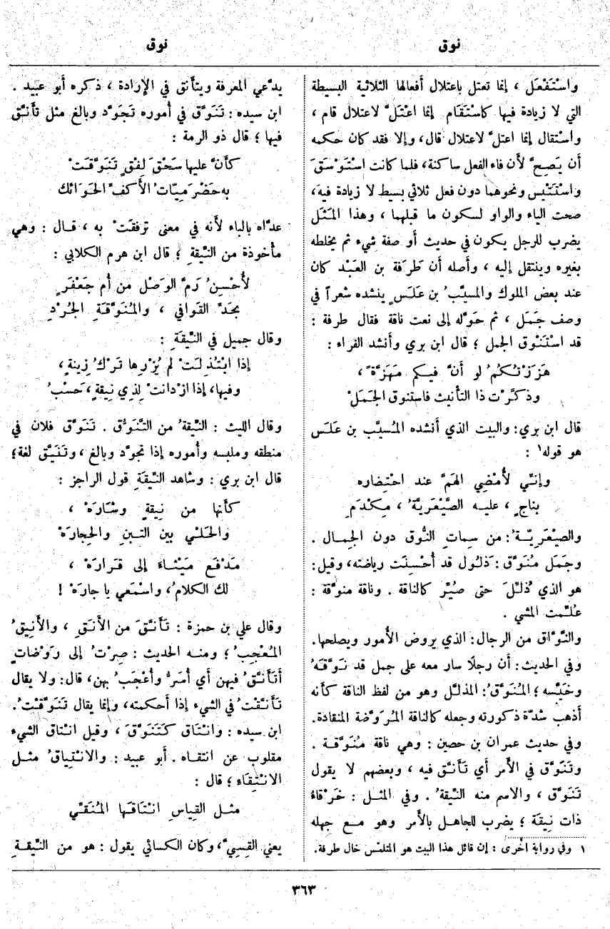 وتَنَوَّق فِي الأَمر أَي تأَنَّق فِيهِ، وَبَعْضُهُمْ لَا يَقُولُ تَنَوَّق، وَالِاسْمُ مِنْهُ النِّيقةُ. وَفِي الْمَثَلِ: خَرْقاءُ ذَاتُ نِيقَة؛ يُضْرَبُ لِلْجَاهِلِ بالأَمر وَهُوَ مَعَ جَهْلِهِ يدَّعي الْمَعْرِفَةَ ويتأَنق فِي الإِرادة، ذَكَرَهُ أَبو عُبَيْدٍ. ابْنُ سِيدَهْ: تَنَوَّق فِي أُموره تَجَوَّد وَبَالَغَ مِثْلُ تأَنَّق فِيهَا؛ قَالَ ذُو الرُّمَّةِ: