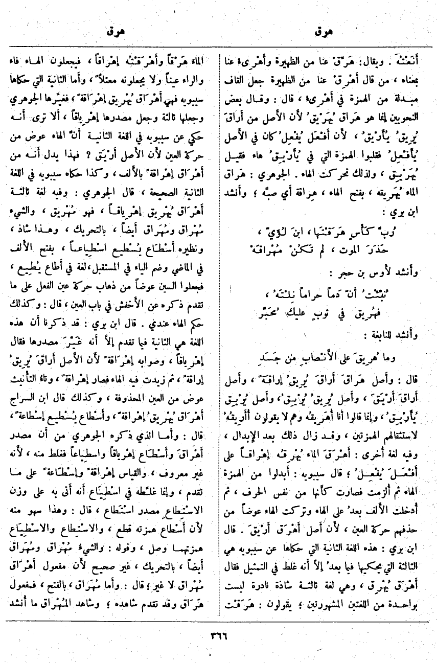 قَالَ: وأَصل هَراق أَراقَ يُرِيقُ إراقَةً، وَأَصْلُ أَراقَ أَرْيَقَ، وأَصل يُرِيقُ يُرْيِقُ، وأَصل يُرْيِق يُأَرْيِقُ، وَإِنَّمَا قَالُوا أَنا أُهَرِيقُه وَهُمْ لَا يَقُولُونَ أُأَرِيقُهُ لِاسْتِثْقَالِهِمُ الْهَمْزَتَيْنِ، وَقَدْ زَالَ ذَلِكَ بَعْدَ الإِبدال، وَفِيهِ لُغَةٌ أُخرى: أَهْرَقَ الْمَاءَ يُهْرِقُه إهْراقاً عَلَى أَفْعَلَ يُفْعِلُ؛ قَالَ سِيبَوَيْهِ: أَبدلوا مِنَ الْهَمْزَةِ الْهَاءَ ثُمَّ أُلزمت فَصَارَتْ كَأَنَّهَا مِنْ نَفْسِ الْحَرْفِ، ثُمَّ أُدخلت الأَلف بعدُ عَلَى الْهَاءِ وَتُرِكَتِ الْهَاءُ عِوَضًا مِنْ حَذْفِهِمْ حَرَكَةَ الْعَيْنِ، لأَن أَصل أَهْرَق أَرْيقَ. قَالَ ابْنُ بَرِّيٍّ: هَذِهِ اللُّغَةُ الثَّانِيَةُ الَّتِي حَكَاهَا عن سيبوبه هِيَ الثَّالِثَةُ الَّتِي يَحْكِيهَا فِيمَا بعدُ إِلَّا أَنه غَلِطَ فِي التَّمْثِيلِ فَقَالَ أَهْرَق يُهْرِق، وَهِيَ لُغَةٌ ثَالِثَةٌ شَاذَّةٌ نَادِرَةٌ لَيْسَتْ بِوَاحِدَةٍ مِنَ اللُّغَتَيْنِ الْمَشْهُورَتَيْنِ؛ يَقُولُونَ: هَرَقْت الماءَ هَرْقاً وأَهْرَقْتُه إهْراقاً، فَيَجْعَلُونَ الْهَاءَ فَاءً وَالرَّاءَ عَيْنًا وَلَا يَجْعَلُونَهُ مُعْتَلًّا، وَأَمَّا الثَّانِيَةُ الَّتِي حَكَاهَا سِيبَوَيْهِ فَهِيَ أَهْرَاق يُهْرِيق إهْراقةً، فَغيَّرها الْجَوْهَرِيُّ وَجَعَلَهَا ثَالِثَةً وَجَعَلَ مَصْدَرَهَا إهْرِياقاً، أَلا تَرَى أَنه حُكِيَ عَنْ سِيبَوَيْهِ فِي اللُّغَةِ الثَّانِيَةِ أَن الْهَاءَ عِوَضٌ مِنْ حَرَكَةِ الْعَيْنِ لأَن الأَصل أَرْيَق؟ فَهَذَا يَدُلُّ أَنه مِنْ أَهْرَاق إهْراقةً بالأَلف، وَكَذَا حَكَاهُ سِيبَوَيْهِ فِي اللُّغَةِ الثَّانِيَةِ الصَّحِيحَةِ، قَالَ الْجَوْهَرِيُّ: وَفِيهِ لُغَةٌ ثَالِثَةٌ أَهْرَاق يُهْرِيق إهْرِياقاً، فَهُوَ مُهْريق، وَالشَّيْءُ مُهْراق ومُهَراق أَيضاً، بِالتَّحْرِيكِ، وَهَذَا شَاذٌّ، وَنَظِيرُهُ أَسْطَاع يُسْطيع إسْطِياعاً، بِفَتْحِ الأَلف فِي الْمَاضِي وَضَمِّ الْيَاءِ فِي الْمُسْتَقْبَلِ، لُغَةٌ فِي أَطاع يُطِيع، فَجَعَلُوا السِّينَ عِوَضًا مِنْ ذَهَابِ حَرَكَةِ عَيْنِ الْفِعْلِ عَلَى مَا تَقَدَّمَ ذِكْرُهُ عَنِ الأَخفش فِي بَابِ الْعَيْنِ، قَالَ: وَكَذَلِكَ حُكْمُ الْهَاءِ عِنْدِي. قَالَ ابْنُ بَرِّيٍّ: قَدْ ذَكَرْنَا أَن هَذِهِ اللُّغَةَ هِيَ الثَّانِيَةُ فِيمَا تَقَدَّمَ إِلَّا أَنه غَيَّرَ مَصْدَرَهَا فَقَالَ إهْرِياقاً، وَصَوَابُهُ إِهْراقةً، لأَن الأَصل أَراقَ يُرِيقُ إِراقةً، ثُمَّ زِيدَتْ فيه الهاء فصارت إِهْرَاقةً، وتاءُ التأْنيث عِوَضٌ مِنَ الْعَيْنِ الْمَحْذُوفَةِ، وَكَذَلِكَ قَالَ ابْنُ السَّرَّاجِ أَهْرَاق يُهْرِيقُ إِهْراقةً، وأسْطاع يُسْطيع إسْطاعةً، قَالَ: وأَما الَّذِي ذَكَرَهُ الْجَوْهَرِيُّ مِنْ أَن مَصْدَرَ أَهْراقَ وأَسْطَاع إهْرياقاً وإسطِياعاً فَغَلِطَ مِنْهُ، لأَنه غَيْرُ مَعْرُوفٍ، وَالْقِيَاسُ إهْراقةً وإسْطَاعةً عَلَى مَا تَقَدَّمَ، وَإِنَّمَا غلَّطه فِي إسْطِيَاع أَنه أَتى بِهِ عَلَى وَزْنِ الاسْتِطاعِ مَصْدَرِ اسْتَطاع، قَالَ: وَهَذَا سَهْوٌ مِنْهُ لأَن أَسْطاع هَمْزَتُهُ قَطْعٌ، والاسْتِطاع والاسْطِيَاع هَمْزَتُهُمَا وَصْلٌ، وَقَوْلُهُ: والشيءُ مُهْراق ومُهَراق أَيضاً، بِالتَّحْرِيكِ، غَيْرُ صَحِيحٍ لأَن مَفْعُولَ أَهْرَاق مُهْراق لَا غَيْرَ؛ قَالَ: وأَما مُهَراق، بِالْفَتْحِ، فَمَفْعُولُ هَرَاق وَقَدْ تَقَدَّمَ شَاهِدُهُ؛ وَشَاهِدُ المُهْراق مَا أُنشد