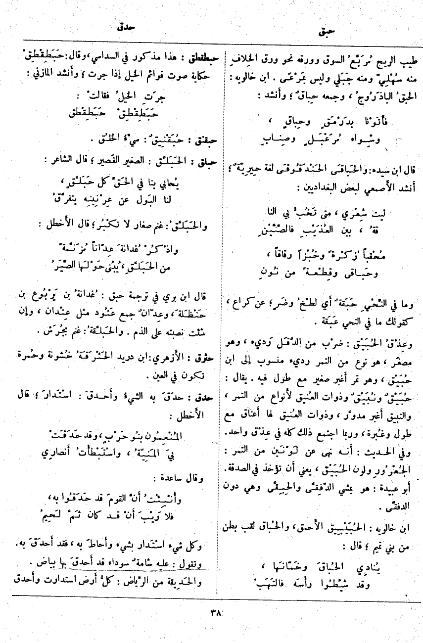 قَالَ ابْنُ سِيدَهْ: والحَباقَى الحَنْدَقُوقَى لُغَةٌ حِيرِيّةٌ؛ أَنْشَدَ الأَصمعي لِبَعْضِ الْبَغْدَادِيِّينَ: