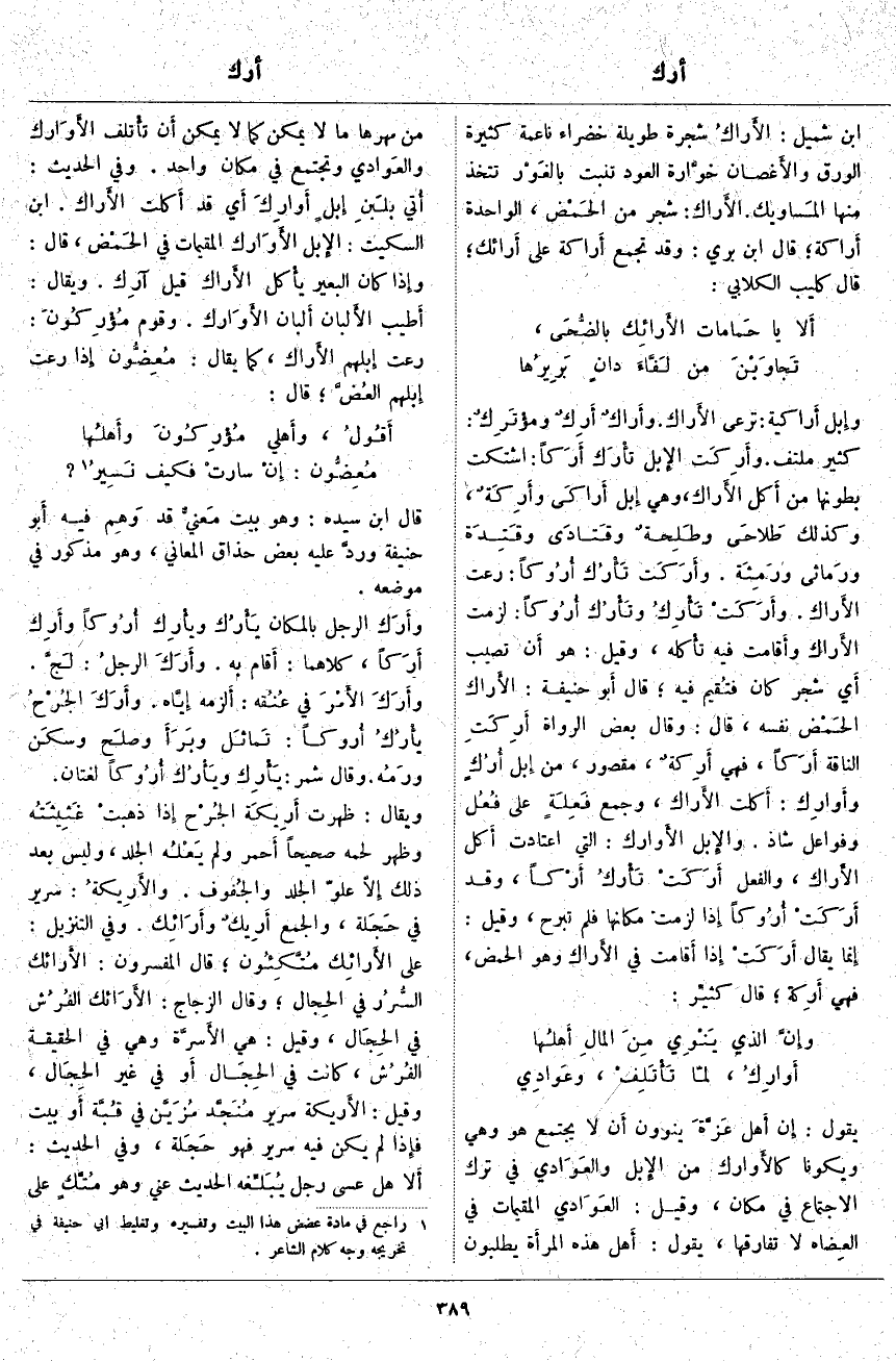 ابْنُ شُمَيْلٍ، الأَراكُ شَجَرَةٌ طَوِيلَةٌ خَضْرَاءُ نَاعِمَةٌ كَثِيرَةُ الْوَرَقِ والأَغصان خوَّارة الْعُودِ تَنْبُتُ بالغَوْر تُتَّخَذُ مِنْهَا المَساويك. الأَراك: شَجَرٌ مِنَ الحَمْض، الْوَاحِدَةُ أَراكة؛ قَالَ ابْنُ بَرِّيٍّ: وَقَدْ تُجْمَعُ أَراكة عَلَى أَرائك؛ قَالَ كُلَيْبٌ الْكِلَابِيُّ: