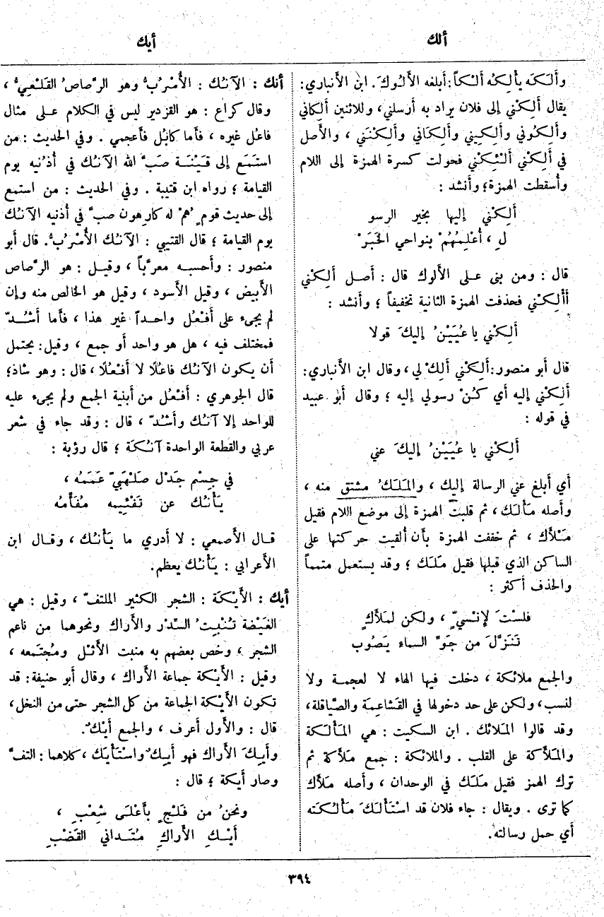 وَالْجَمْعُ مَلَائِكَةٌ، دَخَلَتْ فِيهَا الْهَاءُ لَا لِعُجْمَةٍ وَلَا لِنَسَبٍ، وَلَكِنْ عَلَى حَدِّ دُخُولِهَا فِي القَشاعِمَة والصيَّاقلة، وَقَدْ قَالُوا المَلائك. ابْنُ السِّكِّيتِ: هِيَ المَأْلَكة والمَلأَكة عَلَى الْقَلْبِ. وَالْمَلَائِكَةُ: جَمْعُ مَلأَكة ثُمَّ تُرِكَ الْهَمْزُ فَقِيلَ مَلَك فِي الْوُحْدَانِ، وأَصله مَلأَك كَمَا تَرَى. وَيُقَالُ: جَاءَ فُلَانٌ قَدِ اسْتَأْلكَ مَأْلُكَته أَي حمل رسالته.