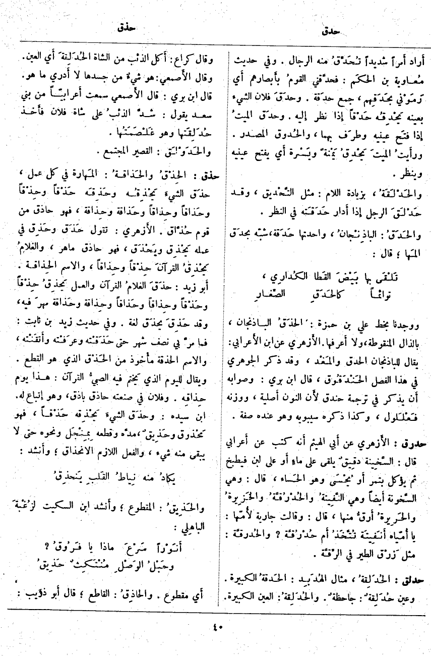 حذق: الحِذْقُ والحَذاقةُ: المَهارة فِي كُلِّ عَمَلٍ، حذَق الشيءَ يَحْذِقُه وحَذِقَه حَذْقاً وحِذْقاً وحَذاقاً وحِذاقاً وحَذاقة وحِذاقة، فَهُوَ حَاذِقٌ مِنْ قَوْمٍ حُذَّاق. الأَزهري: تَقُولُ حَذَق وحَذِق فِي عَمَلِهِ يَحْذِق ويَحْذَق، فَهُوَ حَاذِقٌ مَاهِرٌ، والغلامُ يَحْذِق القرآنَ حِذْقاً وحِذاقاً، وَالِاسْمُ الحِذاقة. أَبو زَيْدٍ: حذَقَ الغلامُ الْقُرْآنَ وَالْعَمَلَ يَحذِقُ حِذْقاً وحَذْقاً وحِذاقاً وحَذاقاً وحِذاقة وحَذاقة مهرَ فِيهِ، وَقَدْ حَذِقَ يحذَق لُغَةً. وَفِي حَدِيثِ