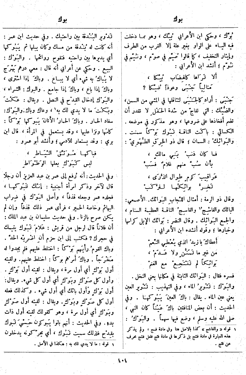 فَسَّرَهُ فَقَالَ: البَوائك الثَّابِتَةُ فِي مَكَانِهَا يَعْنِي النَّخْلَ. والبَوْك: تَثْويرُ الْمَاءِ، وَفِي التَّهْذِيبِ: تَثْوير الْعَيْنِ يَعْنِي عَيْنُ الْمَاءِ. يُقَالُ: باكَ العينَ يبُوكها. وَفِي الْحَدِيثِ: