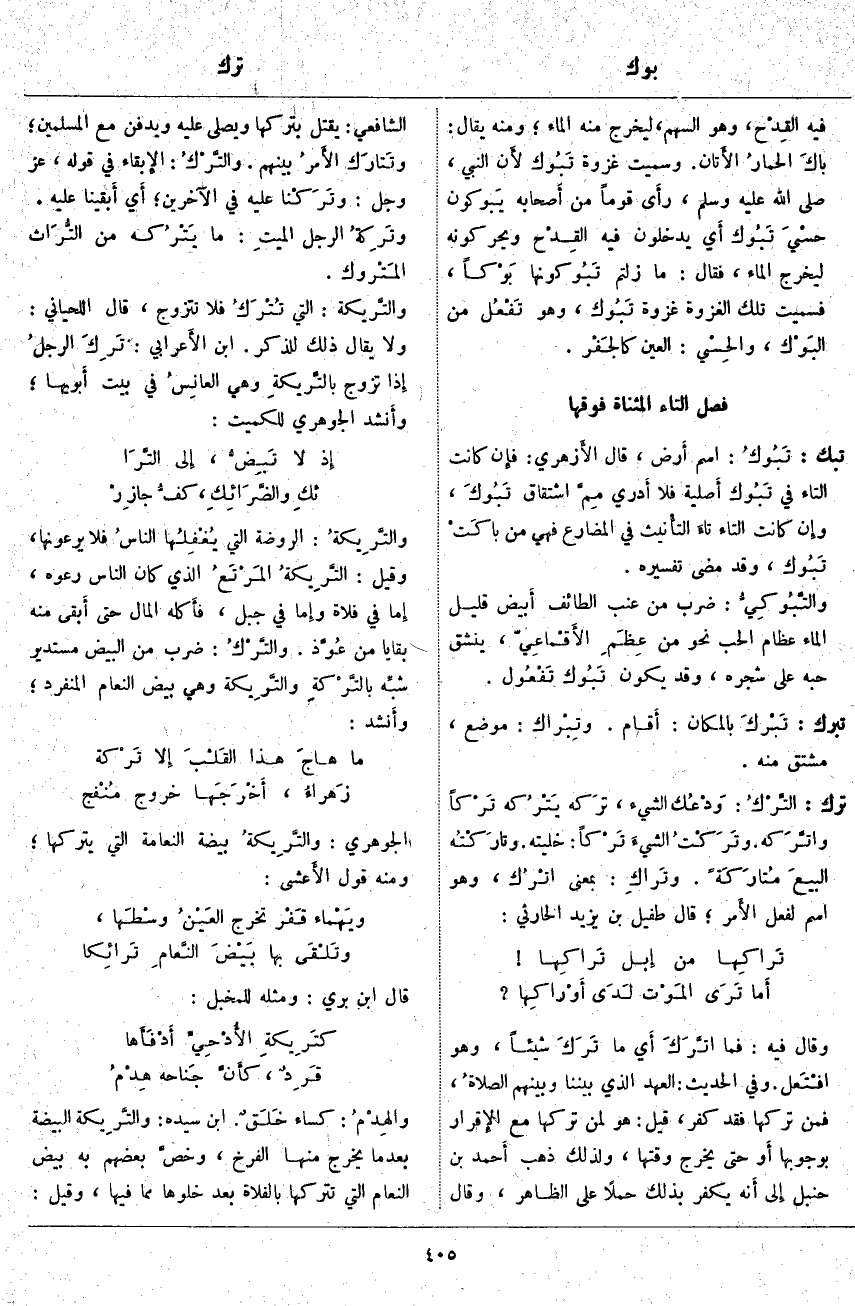 ترك: التَّرْكُ: وَدْعُك الشَّيْءَ، تَركه يَتْرُكه تَرْكاً واتَّرَكه. وتَرَكْتُ الشيءَ تَرْكاً: خَلَّيْتُهُ. وتارَكْتُه الْبَيْعَ مُتارَكَةً. وتَراكِ: بِمَعْنَى اتْرُك، وَهُوَ اسْمٌ لِفِعْلِ الأَمر؛ قَالَ طُفَيْلُ بْنُ يَزِيدَ الْحَارِثِيُّ: