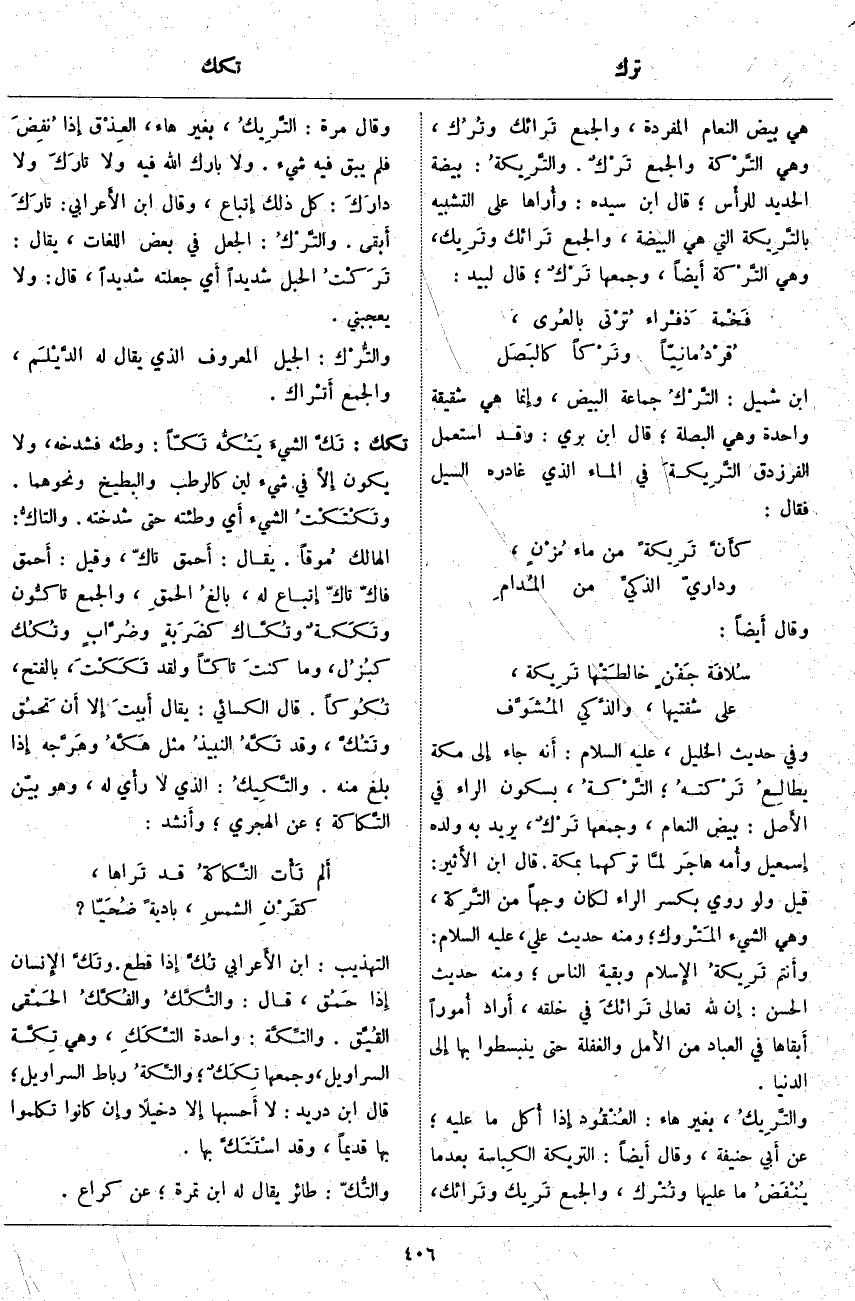 ، أَراد أُموراً أَبقاها فِي الْعِبَادِ مِنَ الأَمل وَالْغَفْلَةِ حَتَّى يَنْبَسِطُوا بِهَا إِلى الدُّنْيَا. والتَّرِيكُ، بِغَيْرِ هَاءٍ: العُنْقُود إِذا أُكل مَا عَلَيْهِ؛ عَنْ أَبي حَنِيفَةَ، وَقَالَ أَيضاً: التريكة الكِباسة بعد ما يُنْفَضُ مَا عَلَيْهَا وتُتْرك، وَالْجَمْعُ تَرِيك وتَرائك، وَقَالَ مَرَّةً: التَّرِيكُ، بِغَيْرِ هَاءٍ، العِذْق إِذا نُفِضَ فَلَمْ يَبْقَ فِيهِ شَيْءٌ. وَلَا بَارَكَ اللَّهُ فِيهِ وَلَا تارَكَ وَلَا دارَكَ: كُلُّ ذَلِكَ إِتباع، وَقَالَ ابْنُ الأَعرابي: تارَكَ أَبقى. والتَّرْكُ: الْجَعْلُ فِي بَعْضِ اللُّغَاتِ، يُقَالُ: تَرَكْتُ الْحَبْلَ شَدِيدًا أَي جَعَلْتُهُ شَدِيدًا، قَالَ: وَلَا يُعْجِبُنِي. والتُّرْك: الْجِيلُ الْمَعْرُوفُ الَّذِي يُقَالُ لَهُ الدَّيْلَم، والجمع أَتْراك.